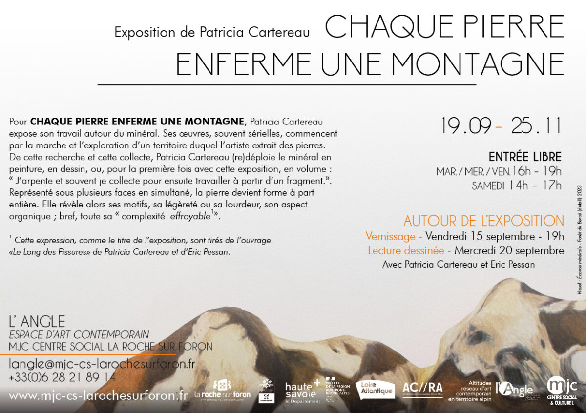 Pour Chaque pierre enferme une montagne, Patricia Cartereau expose son travail autour du minéral. Ses oeuvres, souvent sérielles, commencent par la marche et l’exploration d’un territoire duquel l’artiste extrait des pierres. De cette recherche et collecte, Patricia Cartereau (re)déploie le minéral en peinture, en dessin, ou, pour la première fois avec cette exposition, en volume.