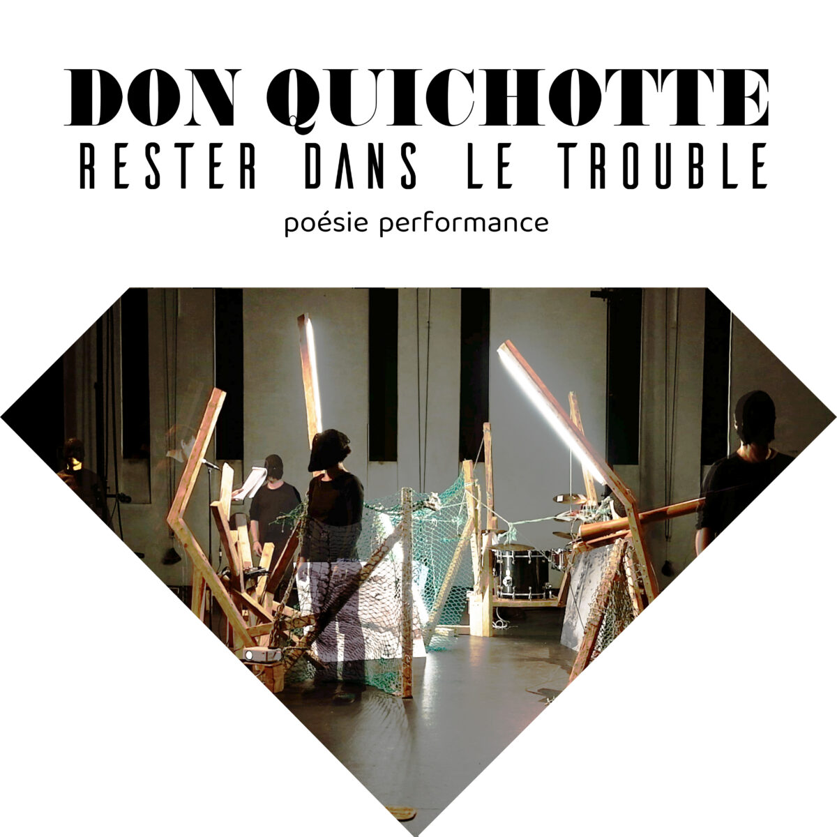 Dans ce projet de performance-poésie, les sculptures, les photographies et les vidéos prolongent le langage narratif. « Don Quichotte – Rester dans le Trouble » est une fable qui défend la fonction positive de la fiction en tant que méthode d’apprentissage et technique de survie dans un monde malade-mental, sombre et lugubre. Le héros est un Don Quichotte, un avatar littéraire qui affronte ses propres obscurités dans un douloureux face-à-face. Il s’enfonce dans les méandres de ses souvenirs pour y puiser sa force, y retrouver l’amour et y trouver sa joie. Alors qu’il se tient au bord d’un soleil noir, il rencontre une vieille chamane nommée Ahiya. Ahiya est perdue dans un temps cosmique, onirique confuse et désorientée. Au contact de Don Quichotte, Ahiya s’éveille et s’hybride avec lui. Ils se métamorphosent en un être mi-masculin, mi-féminin, mi-animal, un esprit mutin, libre des toutes formes.