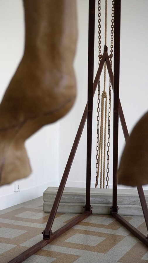 Elle opère en creux pour donner chair à des fragments de corps d’équidés en résine et fibre de verre. Le choix ou le détournement de matériaux et d’objets importe beaucoup et s’intègre à l’acte créatif.