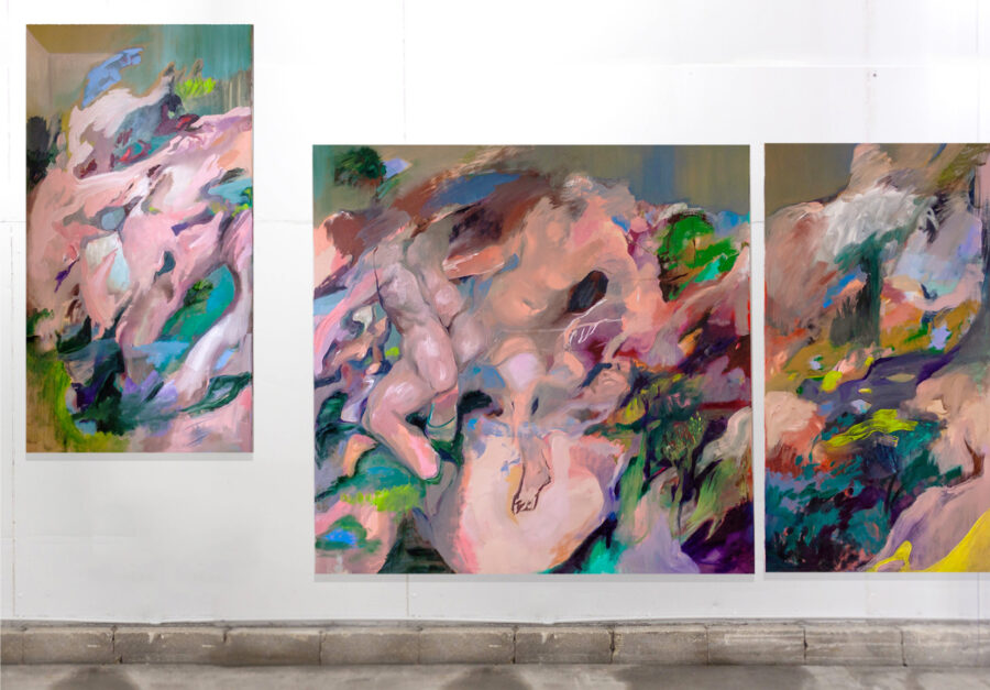 Mais certaines de mes compositions sont réalisées à partir de couleurs plus artificielles (avec des roses magenta notamment), qui font référence à un pan plus contemporain de la pratique picturale. Pour la résidence au PAD à Angers que j’évoquais plus haut, les coloris étaient très artificiels et crus, avec une sursaturation très visible. Le sujet étant une vision apocalyptique et chaotique de corps réunis. La couleur rose était très présente pour évoquer l’aspect charnel.