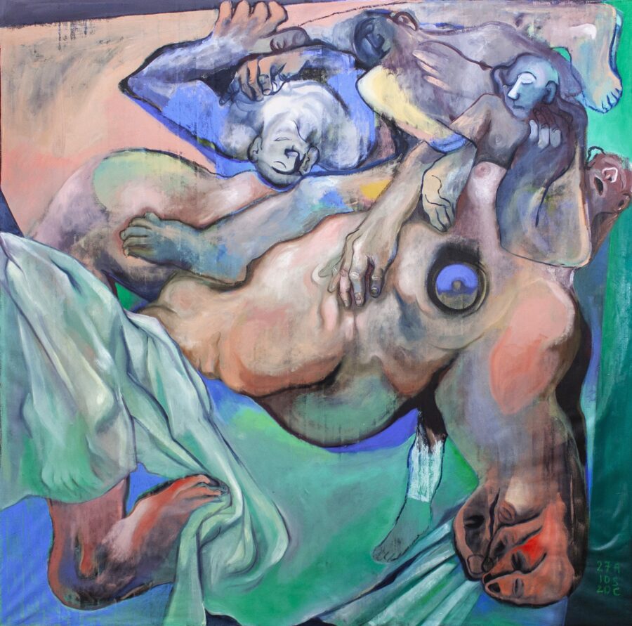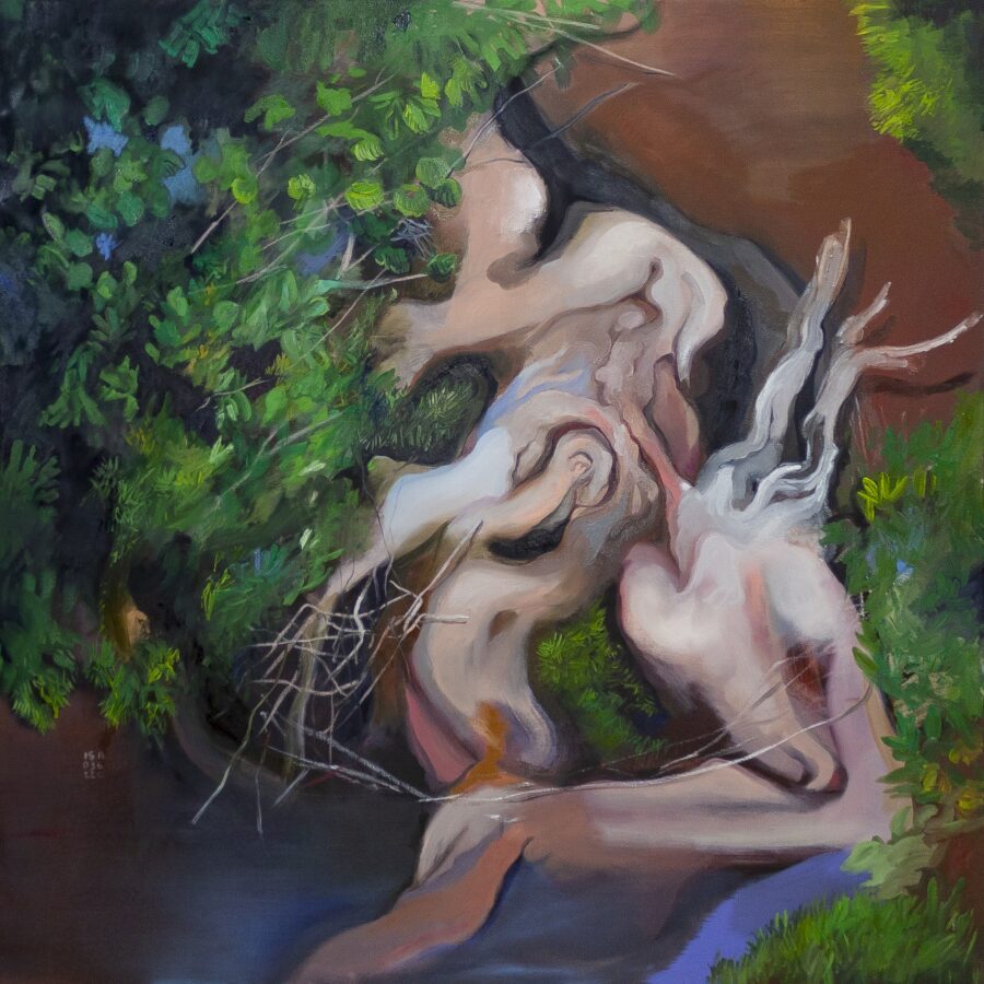 A.S.C. : Mes peintures mettent en scène principalement des corps ou des fragments organiques que l’on peut identifier. Cette direction-là se manifeste de façon variée : elle peut laisser la place principalement au corps sans que l’environnement soit représenté ou alors articuler les deux présences – humaines et végétales – de manière presque fusionnelle. Récemment j’étais invitée au PAD par le collectif BLAST à Angers, j’ai réalisé sur toile libre une composition de grand format intitulée BING BANG. J’y représentais des corps qui s’étreignaient et se compressaient dans un champ pictural dense. Tout y était imbriqué : fragments de végétaux, bustes, bras, mains…
