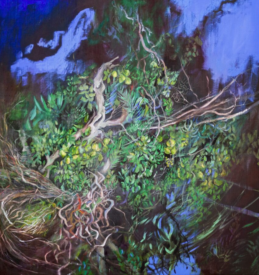 Les compositions d’Alice Suret-Canale pourraient évoquer la représentation de terrariums : une nature mise en cube, et des coupes franches dans le paysage, comme sous l’effet d’une vitre ou d’un fil à beurre. L’artiste nous donne à voir un échantillon du vivant, saisi comme si on avait le nez à ras de cette nature foisonnante. La ligne de flottaison remplace souvent la ligne d’horizon : elle permet d’opérer des jeux de surface complexes, la liquéfaction des contours par la couleur ou l’attraction vers une autre réalité plus abstraite. Entre l’abstrait et le figuratif, une pulsation, comme un ressac permanent. Et des effractions d’aplats, puis à nouveau des grandes profondeurs.