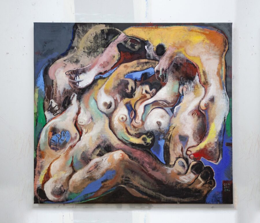 ASC : J’ai travaillé dans mes diverses séries sur l’enfermement du motif dans le champ pictural. La série des corps notamment où les êtres semblent entortillés, enchevêtrés dans un espace contraint.