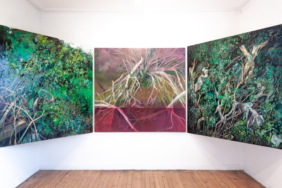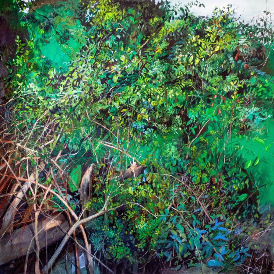 Ces dernières années, a émergé autre un motif qui – pour moi – s’inscrit comme la suite et la continuité de ces recherches : l’entrelacement végétal sans véritable présence humaine. Ces peintures – à l’inverse de ce que proposent habituellement les représentations de paysages – n’ont pas de profondeur, pas d’horizon, pas d’arrière-plan, comme si cette vision de la nature n’émanait pas d’un point de vue humain. En 2022, j’ai réalisé une série de paysage de grands formats que j’ai produit dans l’atelier. Ce ne sont donc pas des peintures réalisées sur le motif (comme souvent le sont les paysages réalisés d’après photos ou directement à l’extérieur), elles convoquent plutôt l’imaginaire, plus que l’observation. On y décèle la densité d’une végétation endémique qui semble proliférer seule : ces ronces, ces plantes anodines et sans qualités particulières qui nous barrent la vue, nous positionnant dans une proximité avec elles. Je mêlais ici plusieurs points de vues pour ne pas avoir un vision trop figée, trop centrale, comme si le tableau concentrait des perspectives multiples.