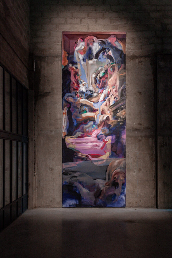 Aller vers le grand : c’est la tentation de l’artiste, prise d’une jubilation physique face à la toile immense, qui permet de travailler dans le détail en immersion totale, sans point de vue d’ensemble. Un mode actif partagé avec le public, qui doit arpenter l’espace pour embrasser le tableau devenu fenêtre-peinture. Dans le sillage du maniérisme et de sa monumentalité verticale, Alice Suret-Canale fait aussi référence, par ce format, à la peinture d’église, sans aller vers un discours religieux : ce rapport entre le ciel et la terre fait particulièrement sens lorsqu’on représente des mondes en gestation, sur le point d’apparaître, de se créer, ou au contraire, dans une vision plus apocalyptique, des mondes en instabilité critique, qui menacent à tout moment de se dissoudre.
