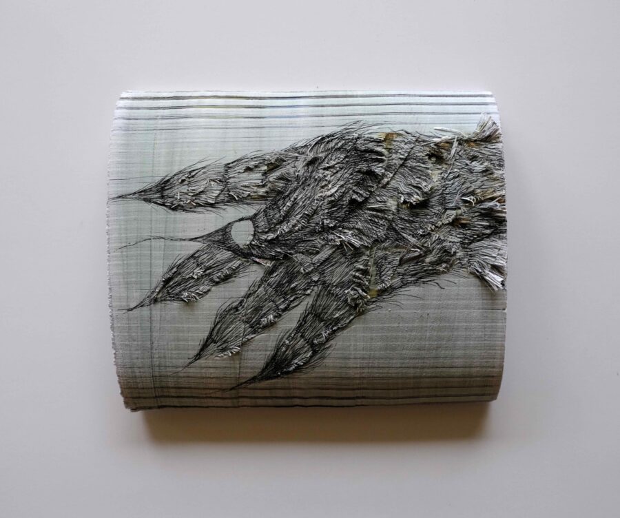 En contournant la palissade, un tout autre travail se dévoile. Une colonne mouvante se dresse dans le passage, gênant presque notre progression dans l’espace. Toutefois, la matière n’est pas aussi inflexible qu’elle n’y parait quand on aborde l’installation totémique qui lui fait écho. Celle-ci se réfère inéluctablement à la culture traditionnelle africaine absorbée par l’artiste lors de ses multiples voyages quasi initiatiques. Les morceaux de tissus débordant du papier corroborent l’idée de la transgression de la matière. Néanmoins, le caractère impalpable des pièces apportent une dimension plus onirique au travail de l’artiste. Comme ce livre bordé d’un halo noir, apparut accidentellement et dont la manipulation se révèle chimérique. Sur les livres de Wittgenstein recouverts d’une feuille de plomb, Benoit Travers entaille le papier. Les pages entremêlés se tournent, comme un événement imprévisible, irréversible. Il est impossible de manipuler ce livre ordinairement, d’en maîtriser le cheminement d’une lecture linéaire. Et le travestissement de la certitude révèle sur l’artiste une appétence accrue pour l’inconnu.