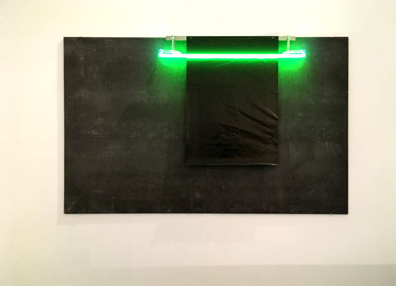 En effet, une fois dans la première salle, une espèce de table à la surface verte donne l’impression de sortir du mur ; plusieurs plantes domestiques (de bureau) en pot sont disposées dessus de manière aléatoire. Pas vraiment dessus car des trous ont été percés dans le plateau afin que les pots en terre cuite tiennent en suspension grâce à leurs rebords plus larges.