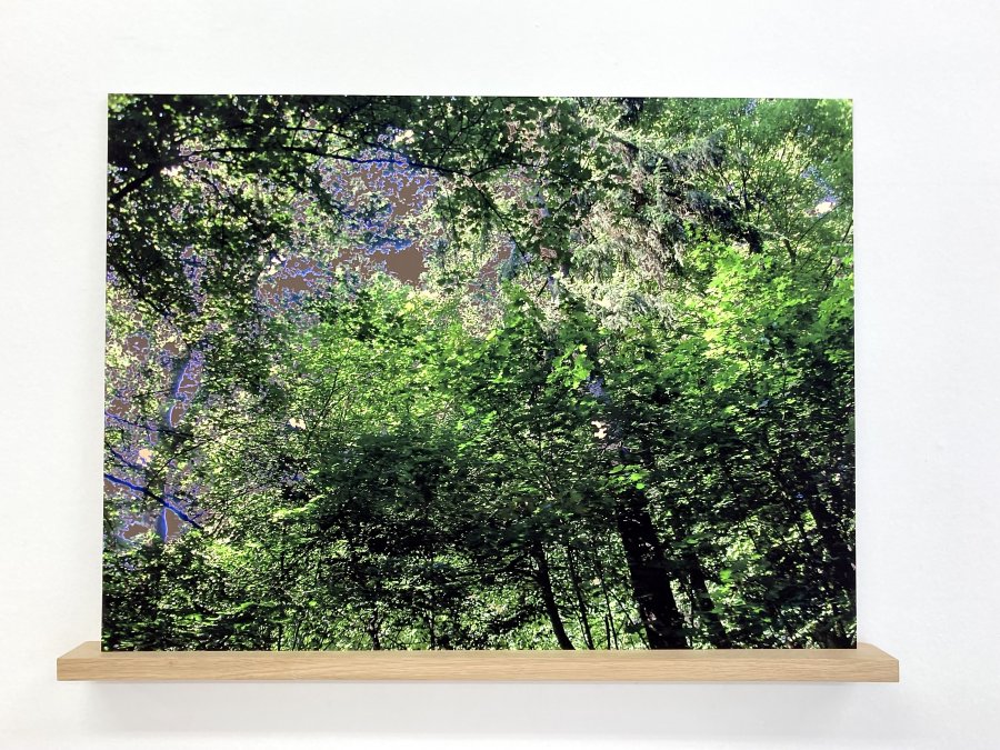 La série Paysage conduction (2022) reprend donc le même principe mais en l’inversant : l’un des genres les plus nobles de la peinture – le paysage – devient photographie, ou plutôt une représentation hybride entre image et visuel, entre réalité et invention fictionnelle. Chacune présente un sous-bois dense avec ses chorégraphies aléatoires de branches et de feuilles, avec quelques éclats de ciels perceptibles dans les creux de la canopée. Lors du tirage (et donc de l’édition) Bernard Calet manipule les couleurs, transforme le bleu du ciel en marron laissant apparaitre ici et là des fulgurantes de violet, saturant certains verts et conduisant la photographie à devenir une image camouflage. Chaque élément s’y présente dans une gamme qui le démarque imperceptiblement de son voisin. La densité des éléments renforce ce brouillage visuel. Dans certains creux de la représentation, quelques rehauts à la feuille de cuivre creuse la surface par leurs éclats métalliques. Ce qui est là, devant le spectateur, est tout autant un équivalent d’un paysage naturel qu’une évocation de l’énergie circulant dans et hors d’une image désormais fictionnelle. Telles ces représentations de cerveaux, de synapses, de réseaux infinis, ces œuvres travaillent à la frontière entre plusieurs registres : celui de l’attestation du réel et celui d’une modélisation des énergies (que ce soit celle du cerveau humain ou des ordinateurs). Le spectateur ne sait ce qu’il doit analyser dans cet entre-deux disruptif.