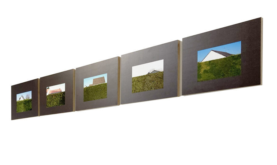 Moving inside est un rassemblement, rassemblement d’œuvres ayant pour premier point commun d’avoir été imaginées et réalisées ces derniers mois. Bernard Calet n’a jamais fait mystère de ses champs d’investigation : lieux urbains, habitats, mobilité du corps, mode d’apparition du langage dans notre culture ou mises en scène artificielles issues des médias. Mais Moving inside ponctue aussi son œuvre en confirmant certaines de ses intentions quant à notre époque. Ainsi Bri-collage (2020-2021), Icones (2021), deux ensembles de collages s’attaquent ouvertement à la généalogie des visuels contemporains qui ne cessent d’inonder notre univers. Si le premier (Bri-collage) surgit des prospectus de promoteurs immobiliers ensuite découpés et réarrangés, le second (Icones) dénonce l’absence totale de hors champ dans les illustrations des quotidiens nationaux. Ces deux séries ont donc pour ambition une mutation radicale : transformer par l’action – collages ou rehauts – de simples visuels – l’un commercial, l’autre informatif – en images avec leurs impensés et évidemment leurs hors champs. Dans les deux cas, l’artiste prend ouvertement le spectateur à témoin en le contraignant à percevoir ces œuvres comme des réfutations des stéréotypes aujourd’hui à l’œuvre. Dans un cas, la navrante affirmation d’un idéal petit bourgeois (être propriétaire d’un espace construit sans particularité aucune) devient paysage ou le vide – et donc l’imaginaire – prend toute sa place. Dans le second, recouvrir un banal visuel attestant des calamités du monde par des formes géométriques (en couverture de survie) tend évidemment à contraindre le spectateur à s’interroger sur son indifférence face aux événements du monde au sein des médias. D’ailleurs pour mieux réaffirmer le propos d’Icones, Bernard Calet maintient intacte la double page du quotidien national, laissant visible à travers une simple fenêtre l’image rehaussée, son emplacement dans la publication et son rapport d’échelle avec la page.