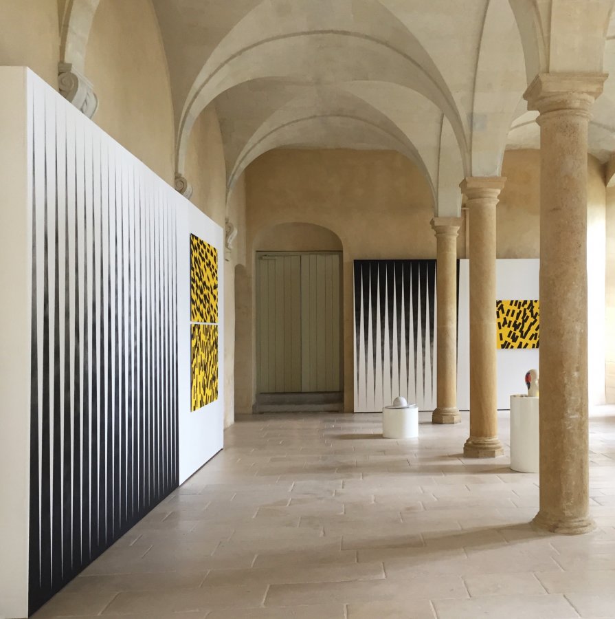 La contemplation, dans l’œuvre d’Irma Kalt, est importante et c’est par son biais, grâce au déplacement du regard(eur), que le temps dont l’artiste ne cesse de jouer révèle sa pleine mesure. Dans un univers abstrait composé de lignes, de formes, de motifs, les titres des travaux induisent tout à la fois une présence et un récit. L’œuvre sériel se nourrit d’apparitions, de glissements, d’effacements. Créé pour Saint-Florent- le-Vieil, le papier peint intitulé Toutes blessent, la dernière tue, auquel Irma Kalt a conservé son nom latin, Vulnerantomnes, ultimanecat, résonne inévitablement comme un memento mori : le papier a été découpé pour offrir la même suite de triangles effilés semblables aux rayons du soleil, présentés les uns montant, les autres tombant, et ceux-ci ont été peints à l’aérosol noir de façon à réduire la saturation de la couleur vers les pointes, amenant dans le gris, au contact de la cimaise restée blanche, des formes mouvantes et fantomatiques. Sur une échelle de temps plus brève, la série d’estampes Suite au soleil s’inscrit dans ces recherches : le jaune intense du fond, traduisant la sensation d’éblouissement face à la lumière d’été, est traversé de traits discontinus noirs qui présagent l’orage attendu et redouté. Parlant de l’exposition Cahier d’école, Éva Prouteau a justement écrit que « pour Irma Kalt, tout est de passage » : tout est passage même et, « pour l’artiste, la beauté fragile des formes ne s’obtient qu’au prix de ce lent processus, au cours duquel le motif se leste de toutes ces strates mémorielles». Lors d’une conversation, Irma Kalt m’a dit combien elle est habitée par le temps qui passe. Médiéviste, je la rejoins, moins intéressé – à la différence d’autres historiens – par le temps passé que fasciné par le temps qui passe, par le temps en tant qu’il passe, c’est-à-dire par le temps tout court et, aussi, par la mort. Comme elle, je me tiens sous le charme – à la fois enchantement et maléfice – et, parce que l’art nous attache à la vie, j’ai admiré, dans l’atelier de l’artiste, cet ensemble de fines bandes peintes à l’aérosol, où jaune, bleu et rouge se mêlent, qu’elle a le projet d’incliner très progressivement afin de les amener de la verticale à l’horizontale avant de revenir à la position de départ et de réaliser un tour complet qui – selon l’importance du nombre – sera celui des mois ou des jours d’une année.