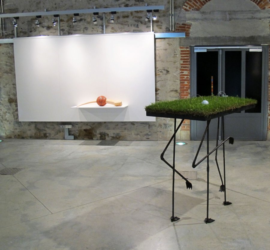Story board distillant une esthétique de la platitude et du non sens, ces images qui déraillent et génèrent des renversements constituent autant de pastilles, fruits d’une idée ou d’un dessin tout droit échappé d’un carnet de notes. Cultivant les incongruités, l’artiste décline les matériaux et les contextes avec application, en témoigne un bouchon de champagne aux dimensions extravagantes placé dans la nature en écho au passé du lieu.