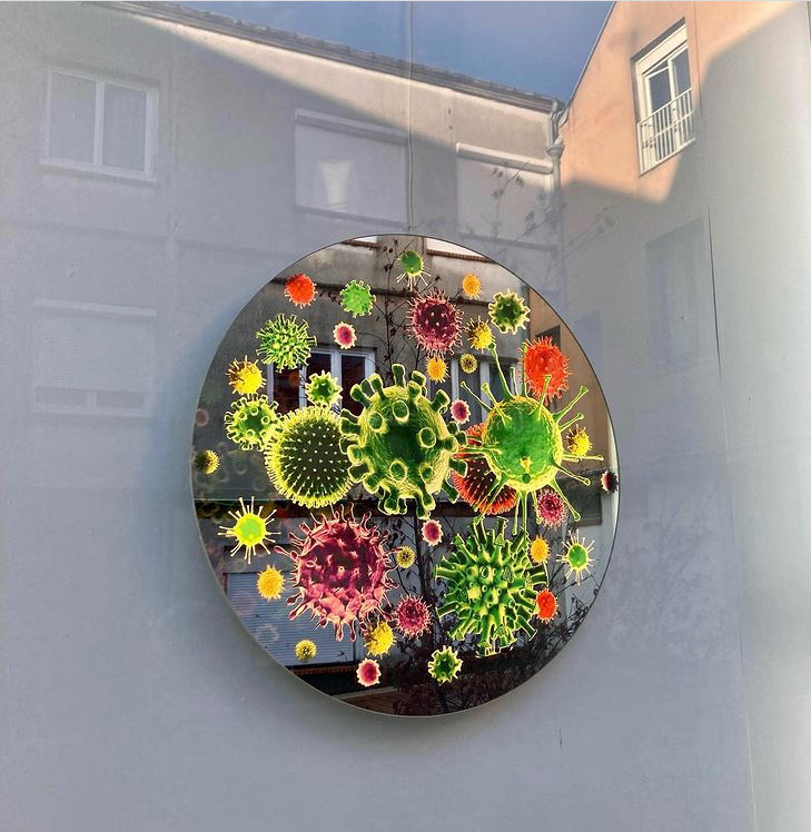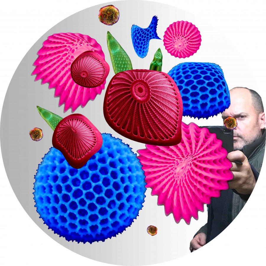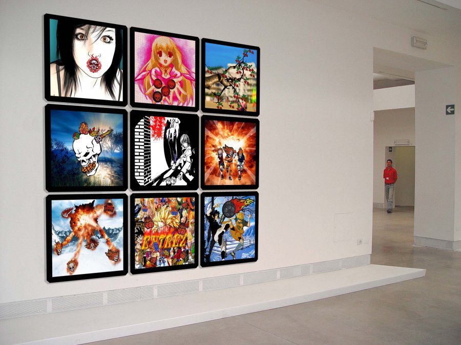Il empreinte bien souvent ses iconographies via l’informatique plus précisément par Internet et à la communication publicitaire ou aux traces photographiques d’événements qu’il provoque (soirées conviviales à thème)