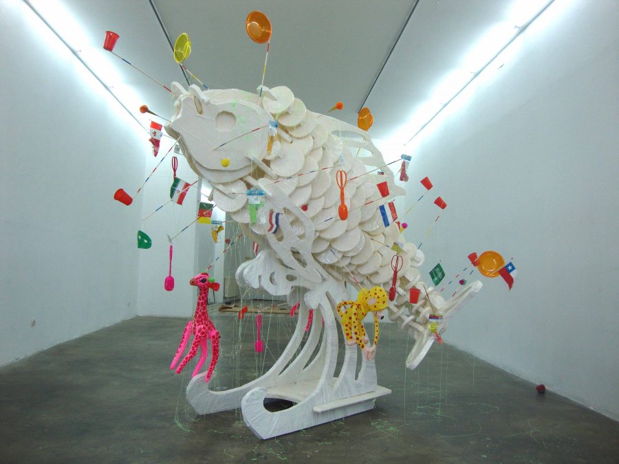 De cette fatalité redoutée Jean-François Courtilat en propose un monde où les personnages sur fond blanc sont affublés de prothèses étranges et colorées, d?excroissances magiques ou malignes Ce sont des poids, des boulets, des casseroles que l’on porte traînent avec soit elles sont parfois des contraintes, mais sont la marque de notre vie singulière et de notre construction.