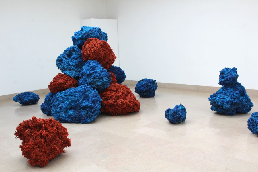 Les objets normés, souvent invisibles, jetables, imperceptibles dans nos quotidiens, voire indésirables, prennent corps. L’artiste, par une pratique d’ordre artisanale, les amène à devenir toute autre chose. Assemblés, hybridés, ils participent à l’élaboration de formes organiques, animales ou végétales. Les ficelles agricoles en polypropylène bleu et rouge sont fondues au décapeur thermique. Le matériau mou devient dur comme une roche piquante et rugueuse. Julie Maquet dispose plusieurs blocs colorés les uns sur et près des autres pour former un paysage corallien. Il en est de même lorsqu’elle réalise l’installation Mue (2018) à partir d’éponges en acier. Ces dernières sont dépliées et suspendues dans l’espace. Elles rappellent un groupe de méduses, des éléments vestimentaires ou encore un dégagement de fumée. Les capsules de vin pliées disposées au sol (Cadavre – 2015) oscillent entre un tas de feuilles mortes ou bien un nid s’insectes morts. Les œuvres sont potentiellement croissantes et mouvantes. Un déplacement est opéré entre une production industrielle et le simulacre d’un paysage. L’artificiel se frotte au naturel. Tout comme la nature, la production industrielle a horreur du vide. Les sculptures et installations déploient un dialogue complexe entre les antagonismes : art-artisanat, artificiel-naturel, éphémère-pérenne, fragile-solide, vivant-immobile. L’artiste travaille alors l’évocation de corps et de paysages vivants. L’usage d’objets et de matériaux trouvés, abandonnés, récupérés, participe d’une reconstitution, d’une réincarnation de corps à la fois étranges, poétiques, physiques et sensibles.