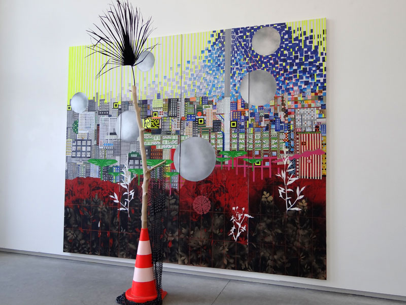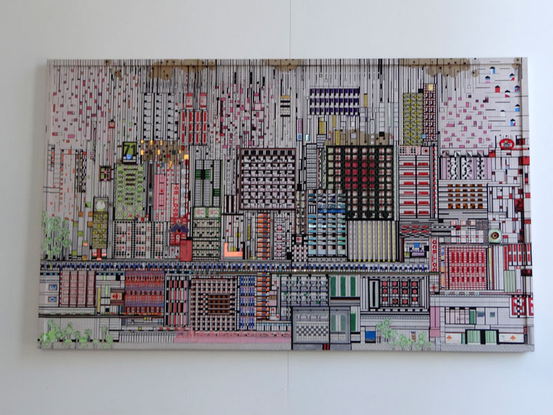 « Land–Scale », la ville-paysage se décline en carrés et en rectangles découpés aléatoirement, habillés par ces papiers colorés, cernés de noir. Une vision syncrétique des mégapoles modernes vibre alors comme un espace chimérique et utopique, habité joyeusement par ces humains dont on ne connaît que les vestiges archéologiques.