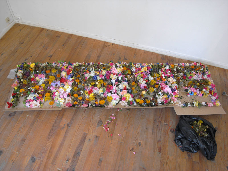 Une tentative d’épuisements des rébus citadins que l’artiste collectionne méticuleusement jusqu’à renouveler leur destination initiale par un travail sculptural empreint de surréalisme. Branches peintes agrémentées de minuscules chaussures de Barbie, fleurs artificiels agglomérés à l’intérieur d’un carton, plante d’intérieur délicatement composée d’une infinités de petits objets plastiques trouvés par hasard. En jouant sur les dimensions macro et micro, Laurence Landois recompose une ville miniature (Monument II, 2006) réalisée à partir d’assemblage de déchets urbains en plastique qu’elle illumine de l’intérieur, créant une skyline nocturne intensément coloré d’une cité imaginaire. grenade, Bora Bora, Floride, La Havane et autres destinations de rêve donnent leur nom à des caissons lumineux qui calquent les formes tout en rondeurs idylliques de piscines glanées dans des catalogues de voyage des tours operators.