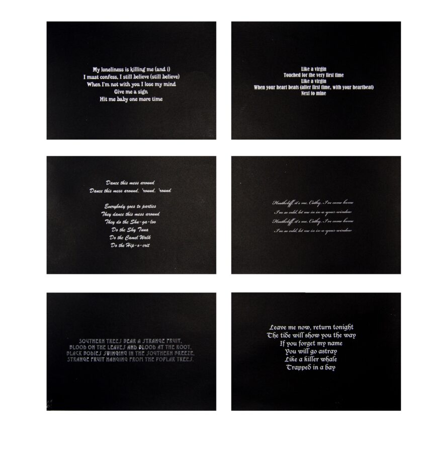 En pénétrant cet espace syllogomaniaque, nous découvrons les deux vidéos — le film qui diffuse le chant du chœur et l’archive du tournage — qui renforcent ou dévoilent le mystère de l’installation. Ainsi, à travers elle, l’artiste nous révèle la présence de ces voix, celles qui nous hantent et nous habitent, sans que nous y prenons garde, issues des ritournelles de notre enfance, des tubes musicaux de notre adolescence mais aussi celles, plus lointaines, héritées de nos ancêtres, que Lou Villapadierna qualifie d’outre-voix. En résonance à ces outre-voix, nous sommes confronté·es à la question de l’inaudible rendu audible avec l’œuvre elliptique de Dominique Blais dont les micros, devenus enceintes, diffusent un son enregistré d’une aurore boréale, capté lors d’une résidence de l’artiste au pôle Nord, qui pourrait être perçu comme celui du chant des cigales. Une autre œuvre-compagne interpelle activement depuis la rue. Celle de l’avocate artiste Carolle Sanchez, qui investit la vitrine principale par un collage juridique de la Déclaration des droits des voix du vivant des mots, susceptibles d’être lus à voix haute, à voix basse ou en lecture silencieuse. Lou Villapadierna nous invite généreusement à explorer une exposition aux multiples ramifications, composée en différentes strates interprétatives pour penser notre rapport au monde, qu’il soit régi par le droit, par la mémoire collective ou individuelle, par les croyances et les mythes. Elle murmure notre monde.
