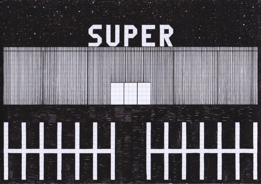 Olivier Garraud s’est employé à couvrir l’immense mur du centre d’art de Pontmain, qui est précisément dix-sept fois plus grand que la surface d’un A4. Surmontant un bâtiment simplement formalisé par un rectangle bardé de lignes verticales vibrantes, l’enseigne SUPER s’étale impérieusement, sur fond de voie lactée ; au premier plan, le tracé au sol des emplacements de parking se dresse comme une barrière hostile. Point de présence humaine. Et pourtant, « dans un monde totalement colonisé par l’homme, le supermarché n’est-il pas devenu le gîte naturel de l’espèce ? »2