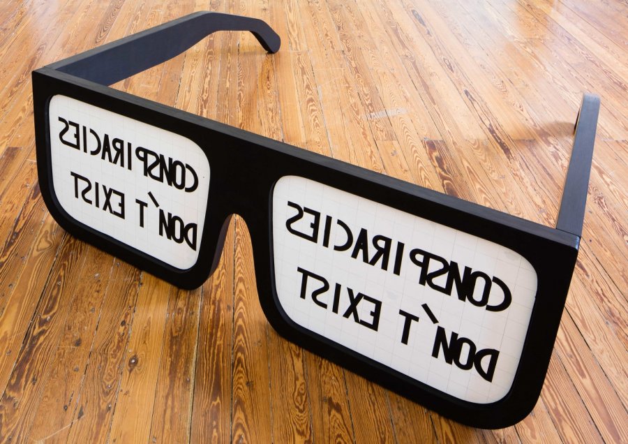 Comme un dessin qui aurait suffisamment gonflé pour devenir volume, la sculpture Conspiracies don’t exist arbore un statut incertain, entre accessoire surdimensionné à l’échelle d’une enseigne de magasin, et objet flottant, presque virtuel, conservant ses qualités d’épure graphique. Instrument de vision oblitérée, cette paire de lunettes