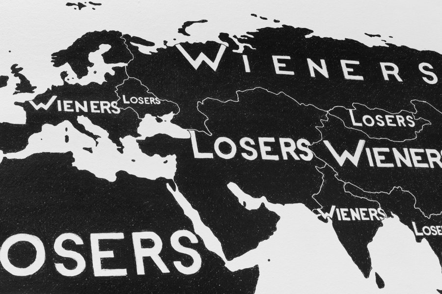 Glaneur et observateur ironique de la société, Olivier Garraud revendique le rapport analogique et low tech au monde qui l’entoure comme une façon narquoise de poser son regard sur celui-ci. Volontiers grinçantes, ses productions participent du détournement généralisé de signes empruntés au réel ainsi qu’à une sphère médiatique et contemporaine. Si un tel travail s’alimente en partie par l’usage élargi du crayon, celui-ci développe prismes et compilation d’icônes par le biais de séquences animées, d’installations mixtes ou d’accrochages muraux.Tel que le ferait un Raymond Carver du début du XXI ème siècle, de par ce corpus empruntant au quotidien, c’est à travers la pose du mémorialiste involontaire que l’artiste dresse le tableau d’un zeitgeist désenchanté. Explorateur de l’inconscient collectif, Olivier Garraud amalgame les indices racontant en filigrane la société de consommation, la solitude urbaine, le branding, la religion et l’athéisme… La typographie, le slogan ou la citation constituent les prétextes à un album qui fait défiler textures et sources hétérogènes sur fond d’écroulement des idéologies. Entre idée de croyance et référence à l’« ère du soupçon », l’artiste ausculte le climat ambiant et développe un paysage absurde sur le mode d’une boîte noire qui évoquerait autant de fables à l’heure d’Internet et des décennies qui suivirent la chute du mur de Berlin. Son wall drawing planisphère où sont répertoriés les Losers et les Wieners cristallise à la fois une lecture du monde où les hégémonies géopolitiques ne tiennent qu’à une faute de frappe. Coulures apparentes et primitivistes, intitulés erronés et stratégie de l’approximation, l’esthétique délibérée de l’a peu près se conjugue au décalage des repères, comme Des poings et des pieds mettant en scène le signe des Black Panthers et d’I want you ou Babies please don’t go fabriquées en papier attrape tue mouches.