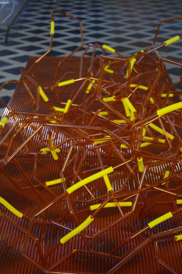 Pourtant, les sculptures de Pierre-Alexandre Rémy, souvent, inversent en partie ce dispositif : il est difficile d’en faire le tour parce qu’elles sont éclatées, proliférantes et tentaculaires. Éloigne l’horizon, Tohu-Bohu ou Le plafond se déchire s’étendent dans tout l’espace, dans plusieurs directions, du sol au plafond. Elles encerclent le regardeur et gênent sa perception en multipliant et dispersant les points focaux. Ce qui est à regarder n’est pas (seulement) devant soi, mais aussi au-dessus, à droite, derrière, à gauche, plus loin… Plutôt que d’embrasser une forme pleine et délimitée, le regard suit une ligne de caoutchouc vert qui serpente sur le sol, se raboute à une barre d’acier blanche, rencontre le changement dur d’un revêtement vinylique rouge, s’enroule le long de vrilles jaune vif d’une bande d’élastomère aplatie… Mais le développement spatial des sculptures ne contraint pas seulement le regard à une dispersion, il oblige également les corps à une déambulation particulière. Puisque tourner autour des sculptures, ou les contourner, ne s’avère pas aussi simple que d’ordinaire, les regardeurs doivent se plier — parfois physiquement — à une circulation contrariée dont les extensions de la sculpture dessinent autant de balises. Le volume simple du cube blanc traditionnel de l’espace d’exposition se trouve fragmenté, divisé, complexifié par la simple présence de la sculpture. Nous devons nous glisser sous, nous faufiler entre, enjamber et contourner. C’est tout le rapport de notre corps à son environnement immédiat qui est ainsi modifié. Le comble est sans doute atteint par Brazil-Bureau, un entrelacs de tuyaux PVC multicolores qui remplit entièrement un box administratif vitré. Contraignant ainsi la libre circulation des corps dans l’espace même