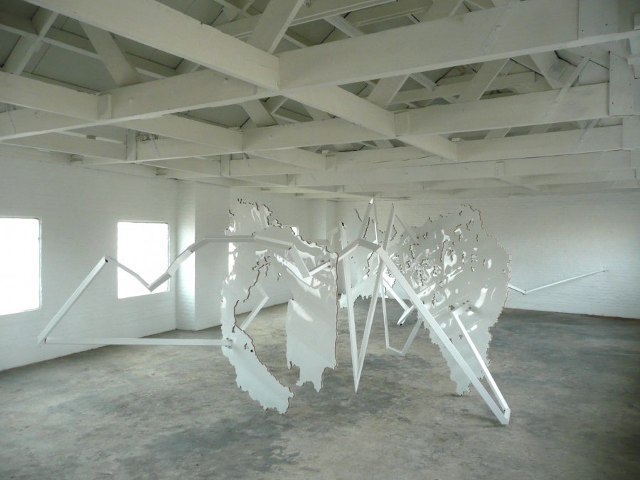 C’est l’hiver 2011. Pierre-Alexandre Rémy est en résidence à Flers, cette fois-ci dans une temporalité de travail plus courte (un mois) et un contexte plus urbain. L’artiste perpétue l’approche graphique et sculpturale qui le caractérise, une mise en tension du projet avec la mémoire et la mesure du lieu. Pour le centre d’art 2Angles, il aborde le territoire selon deux angles, justement : par son dessin (sa cartographie) et par la matière industrielle qui s’y produit, en l’occurrence les articulations pour sièges automobiles fabriquées par Faurécia, l’une des plus grosses entreprises de la région. La carte utilisée, le « corps du lieu » comme il la décrit, est en l’occurrence la carte IGN 15150, sur laquelle l’artiste détoure les zones construites qui constituent la ville. La forme qui en découle lui sert ensuite de matrice graphique déclinée dans une série de trois sculptures, trois émanations subjectives du contexte.