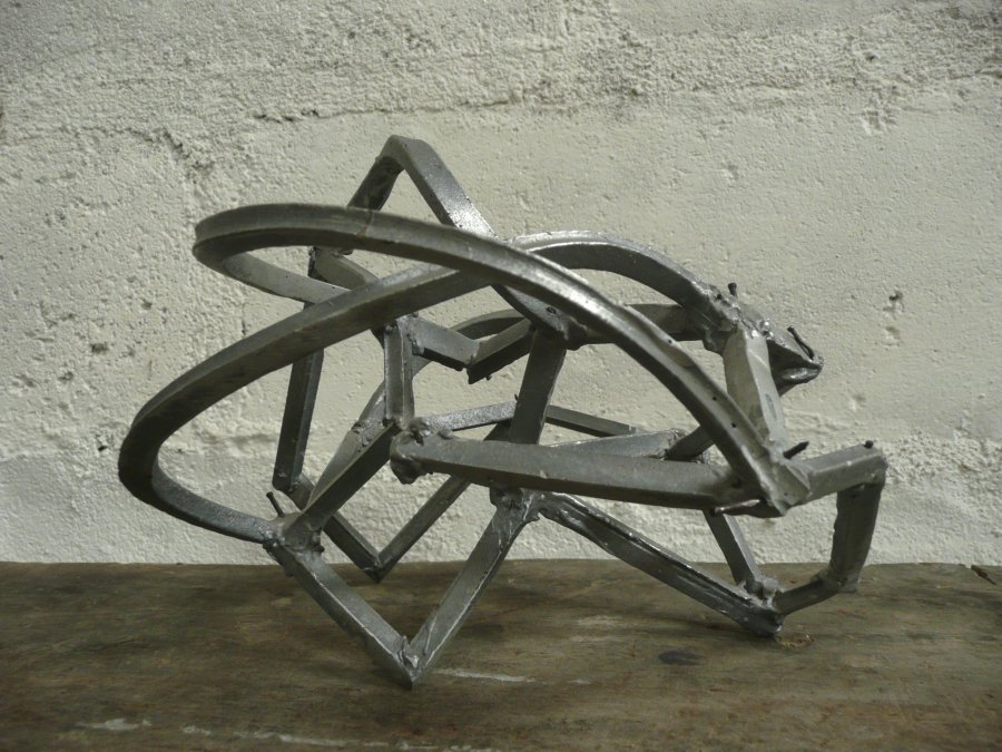 Cette topographie sensible mise à l’épreuve du réel donne lieu à des maquettes à l’échelle 1/10e. L’artiste sculpte les dessins de ses promenades à l’aide de fils de fer travaillés à la main. Les lignes s’animent, s’élèvent, se condensent ou s’étirent et esquissent un dessin dans l’espace. La sculpture naît ainsi : le geste de l’artiste traduit différentes sensations imprimées au cours de ses pérégrinations, de ses marches. De la difficulté des chemins naissent des rythmes contrastés : accélérations, ralentissements, pauses. Le mouvement des lignes qui déclinent, s’élèvent, se croisent et s’entrecroisent livrent une géographie subjective qui met à distance le réel.