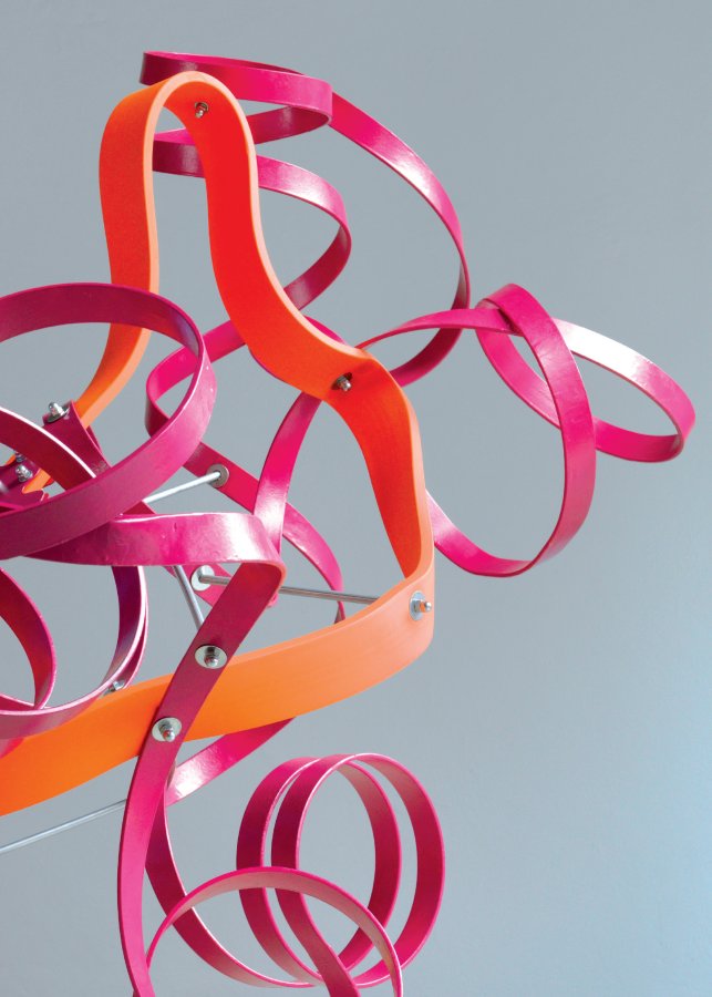 Attentif à cet équilibre, l’artiste encastre ses courbes pour réduire au minimum les points d’accroche et préserver la légèreté globale. Frappés d’apesanteur, ses rubans de polymère teint dans la masse déroulent leurs arabesques dynamiques, et leur couleur dense canalise le regard, l’entraîne à suivre les lignes de découpe hard edge extrêmement graphiques, qui sont aussi des strates et des traits de jonctions, liant oeuvre et contexte, paysage ressenti et paysage réel.