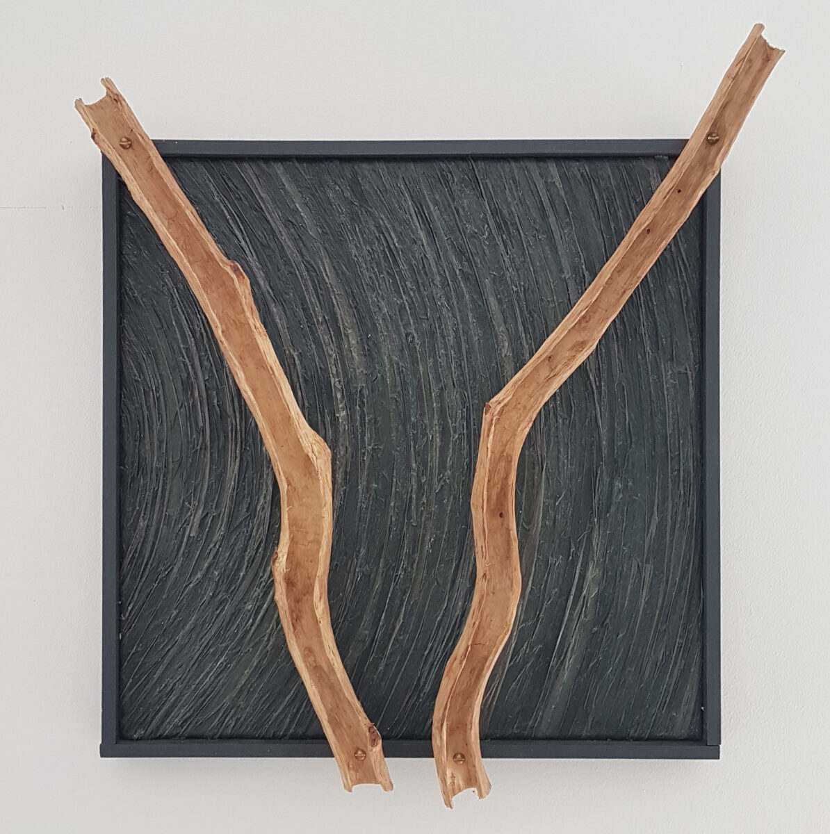 Deux branches de charme creusées, raphia teint en noir marouflé sur toile.