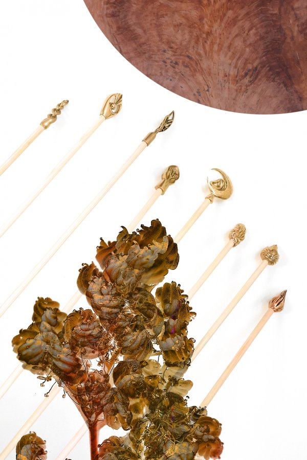 L’artiste a proposé à quatorze étudiantes de DN Made de réaliser une série de bijoux-armes et plus précisément de créer chacune une pointe de flèche originale. Coulées en bronze, ces pointes aux formes diverses, portent un symbole représentant la personnalité de chaque étudiante : œil, flammes, aube, biche, ours, etc.