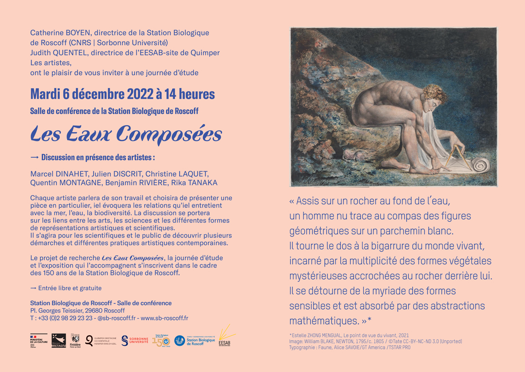 En présence des artistes : Marcel Dinahet, Julien Discrit, Christine Laquet, Quentin Montagne, Benjamin Rivière et Rika Tanaka. Inscriptions: (sur place) https://my.weezevent.com/journee-detude-les-eaux-composees (zoom) https://us02web.zoom.us/j/85881114915