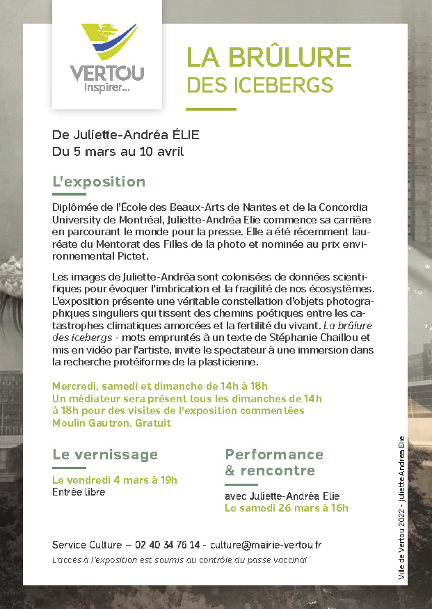 Exposition personnelle de Juliette-Andréa Elie au Moulin Gautron à Vertou. L’exposition présente une véritable constellation d’objets photographiques singuliers qui tissent des chemins poétiques entre les catastrophes climatiques amorcées et la fertilité du vivant. Performance et rencontre avec Juliette-Andréa Elie : le samedi 26 mars à 16h