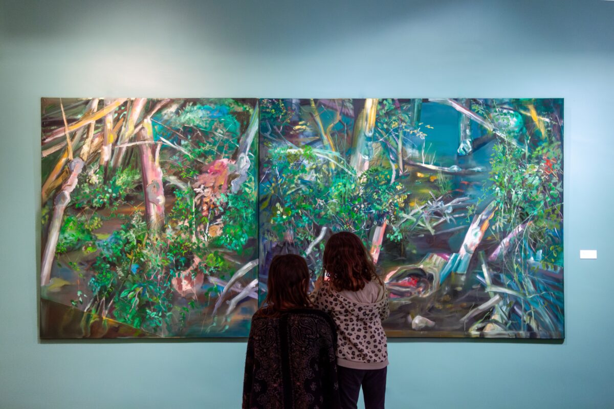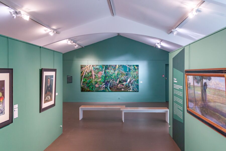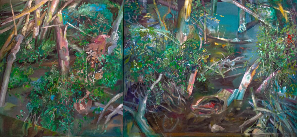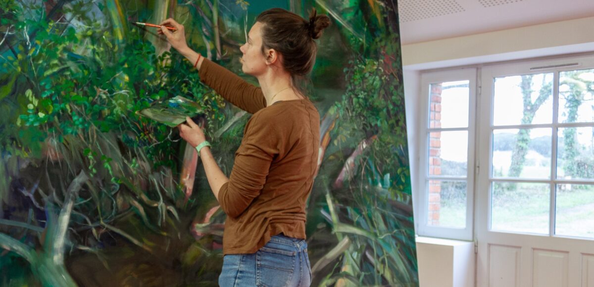 Alice Suret-Canale est peintre, invitée en résidence au cœur du Musée Charles Milcendeau, elle a travaillé dans l’atelier originel du peintre entre novembre 2023 et mars 2024. L’œuvre présentée dans le cadre de cette exposition, intitulée La Réserve, est l’aboutissement d’un travail réalisé in situ par l’artiste, qui s’est inspirée des lieux et qui nous donne à voir le marais breton vendéen à sa manière. Dans sa peinture, basée sur la notion de métamorphose et d’émergence du motif par l’improvisation, Alice Suret-Canale s’intéresse aux relations sensibles qui nous lient à notre milieu à travers des paysages denses qui mettent en scène la diversité du vivant. Cette résidence a été pour elle l’occasion de se concentrer sur le motif du marais, environnement propice à faire se croiser des préoccupations picturales et socio-écologiques. Marais et marécages offrent une riche réserve mythologique et narrative. Zones mouvantes, changeantes et indiscernables : de terre, d’eau et de ciel en reflet, ce sont des environnements hybrides par excellence. Lieux marginaux, frontière sauvage entre Homme et nature exploitée, entre la vie et la mort, ils s’imposent comme symboles la préservation de l’environnement et de la biodiversité. En parallèle de son travail de création, Alice Suret-Canale a pu partager son expérience aux élèves d’écoles maternelles et primaires du territoire Océan-Marais de Monts.