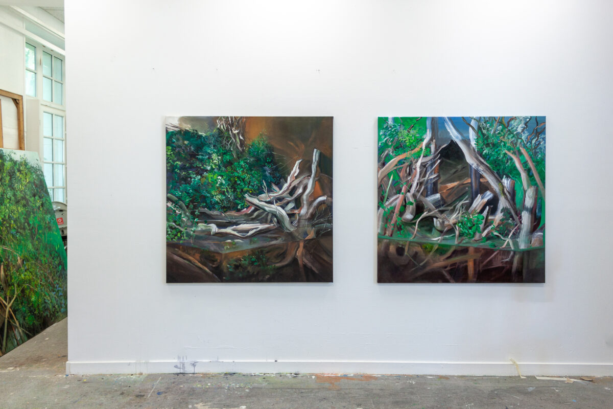 L’artiste nous donne à voir un échantillon du vivant, saisi comme si on avait le nez à ras de cette nature foisonnante. La ligne de flottaison remplace souvent la ligne d’horizon : elle permet d’opérer des jeux de surface complexes, la liquéfaction des contours par la couleur ou l’attraction vers une autre réalité plus abstraite. Entre l’abstrait et le figuratif, une pulsation, comme un ressac permanent. Et des effractions d’aplats, puis à nouveau des grandes profondeurs.