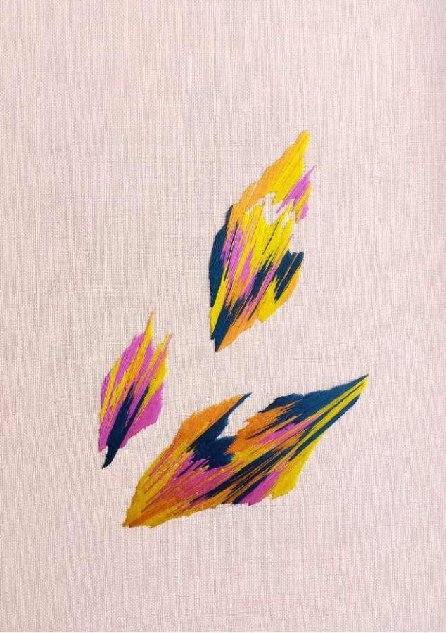 Le médium principal de Sophie Baudry est la broderie libre à l’aiguille et au crochet de Lunéville. Sa matière première est souvent issue de commerces de seconde main, d’heureux hasards et de dons. Elle conçoit ses peintures à l’aiguille comme les expressions de ses décors intérieurs. Un salon Victorien confiné accueille une adolescente qui mâche un malabar, une crique de la méditerranée se dilue dans une avalanche de neige, des « tâches » brodées entre mémoire, faux souvenirs et impressions fugaces.