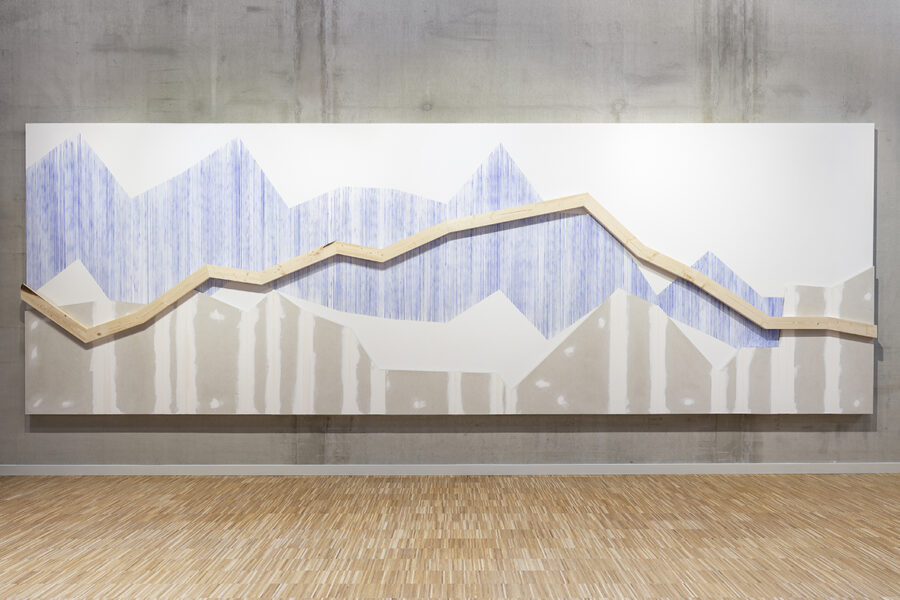 Cette œuvre est une combinaison d’informations, un mélange de données statistiques et géographiques. Olivier Petiteau exploite la forme panoramique de la cimaise pour installer une confusion entre datas et paysage. Les matériaux de construction employés pour incarner ces chiffres initient l’illusion d’une représentation en bâtissant un horizon éphémère.
