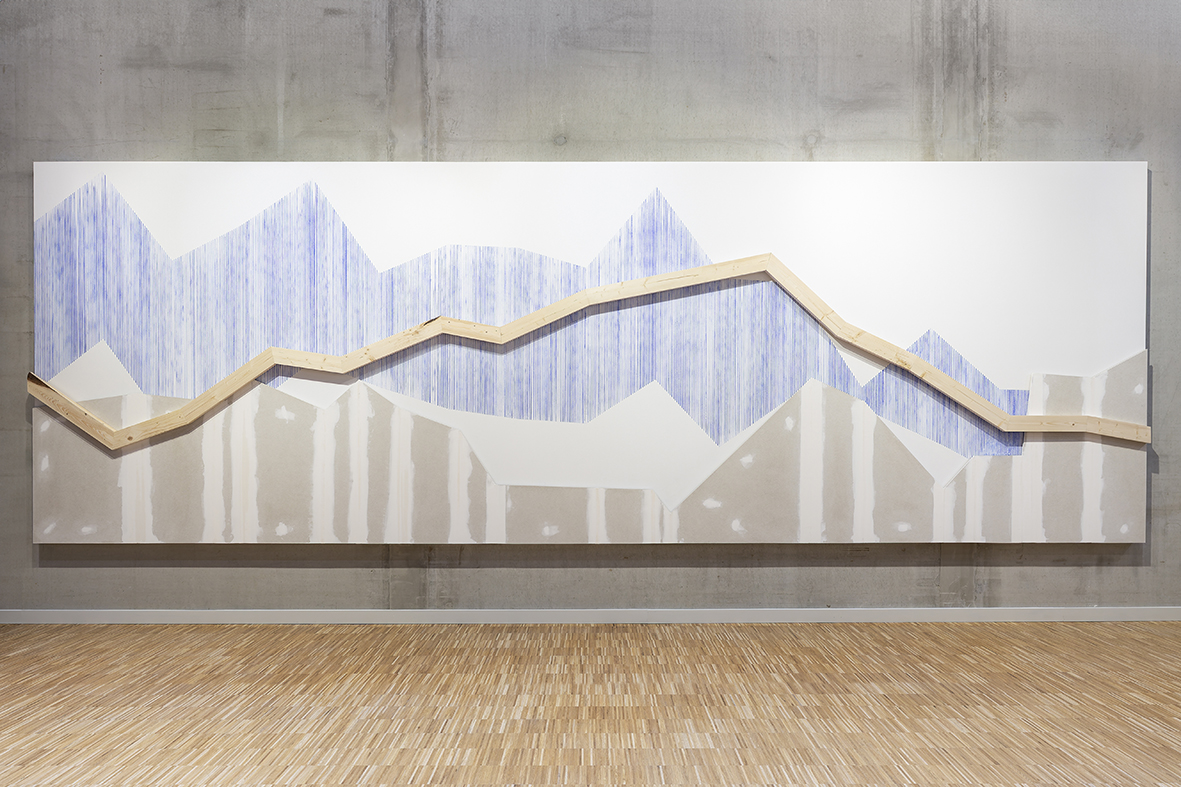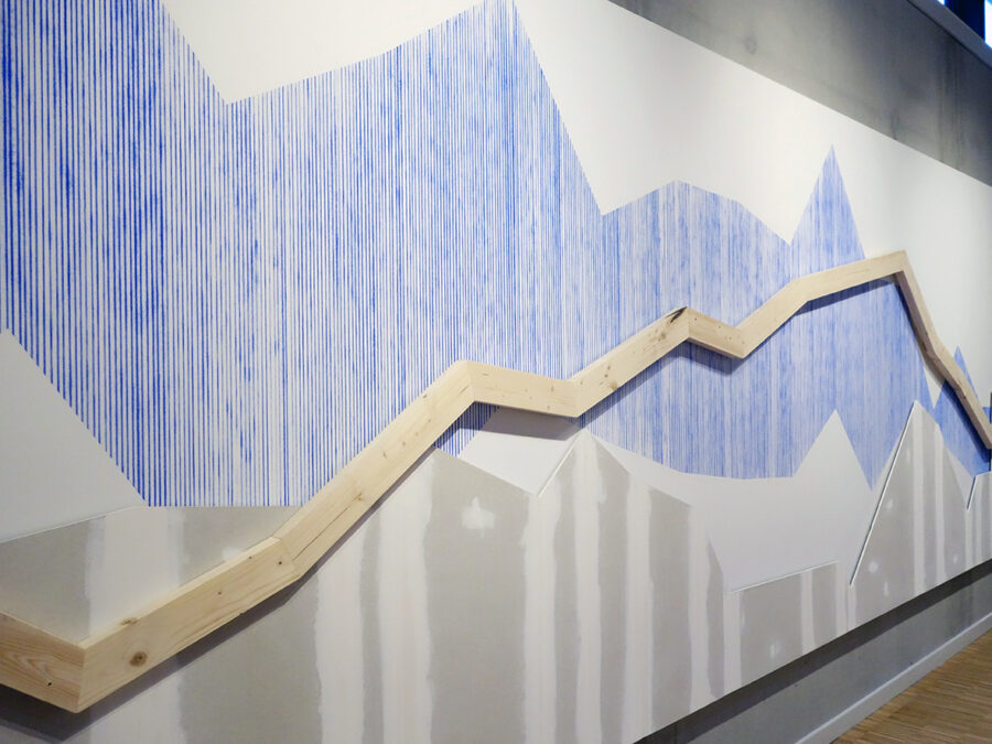 C’est dans cet esprit que nous avons le plaisir d’accueillir Olivier Petiteau et son œuvre Particules fines, Tour de France et fuite des cerveaux (225 x 650 cm), composée de bois, de placoplâtre et de poudre de craie.