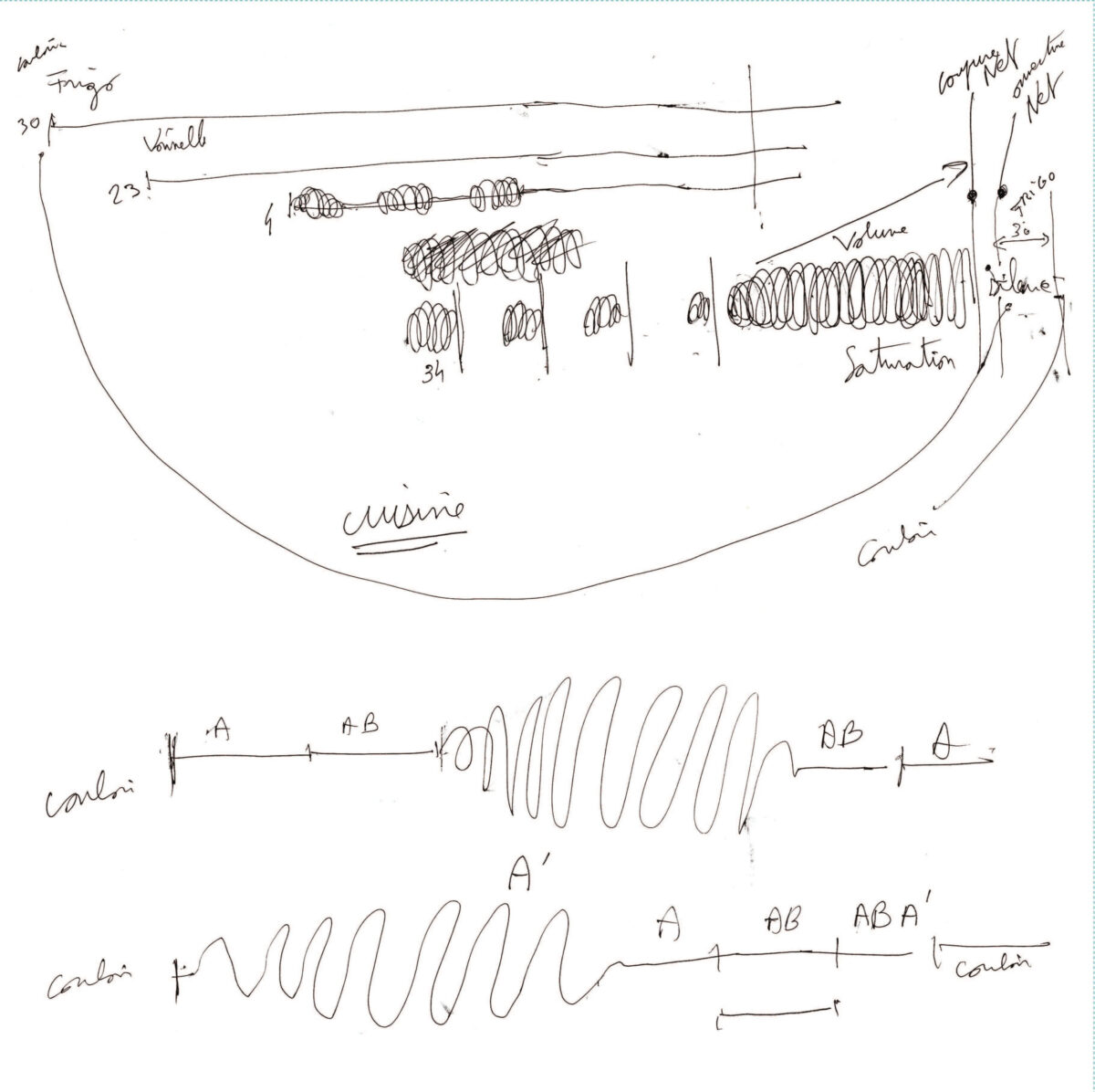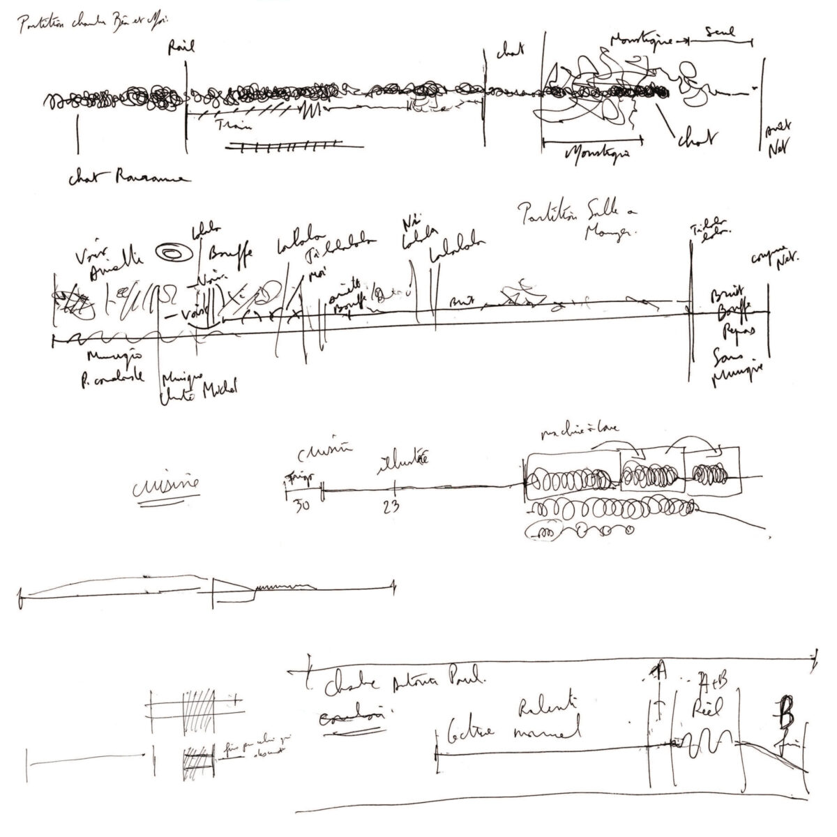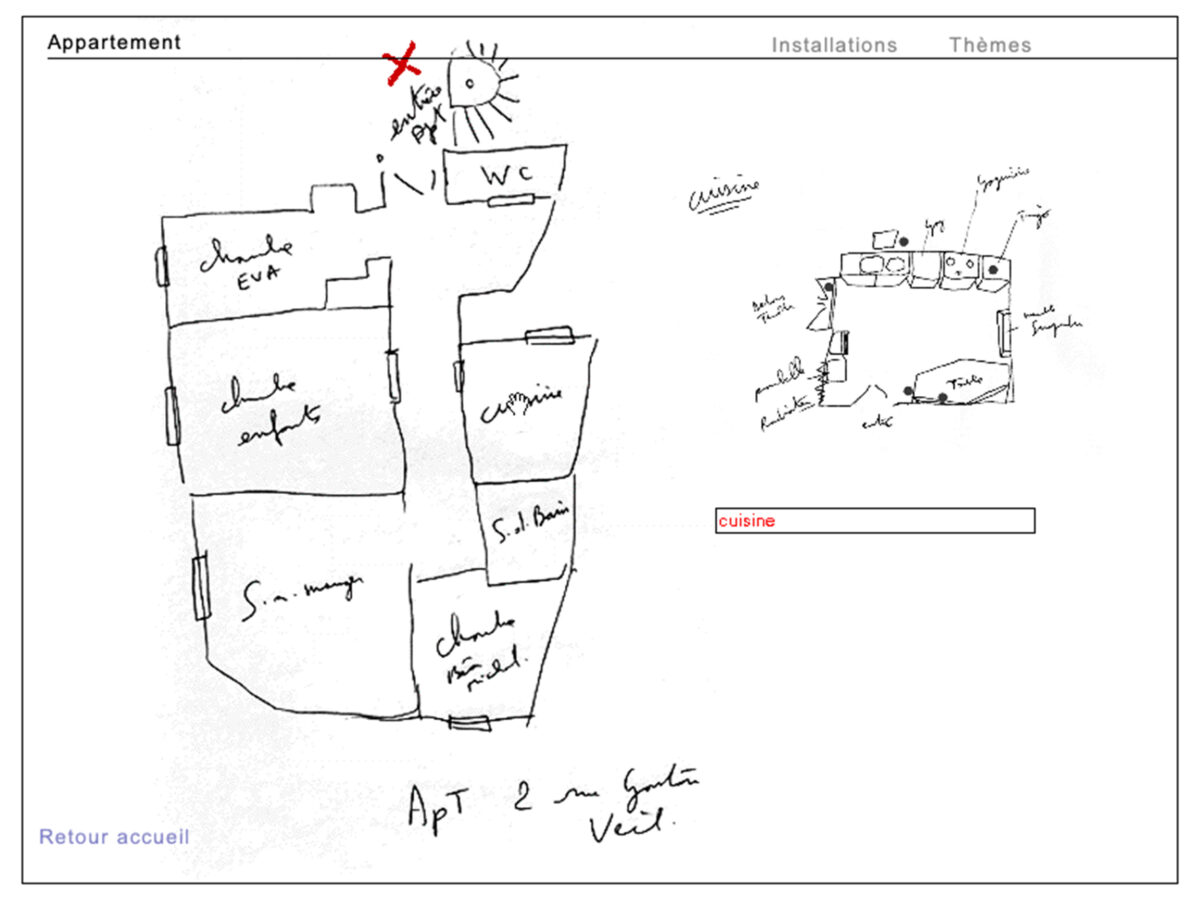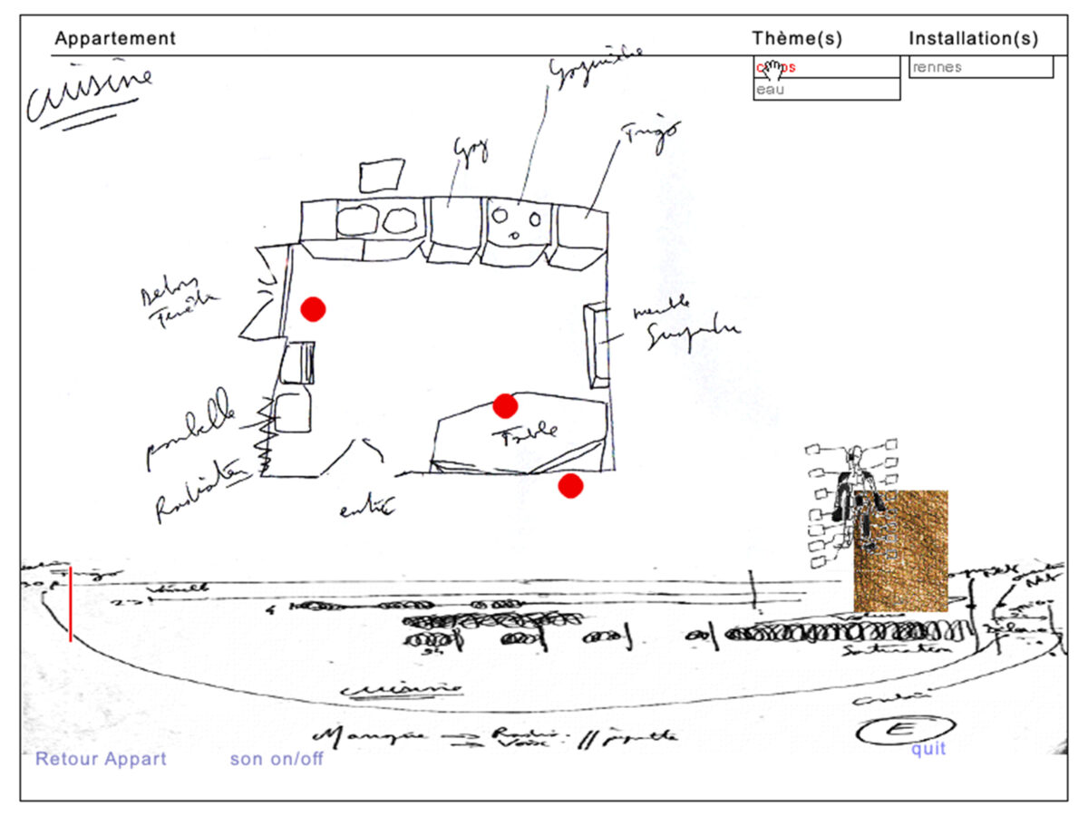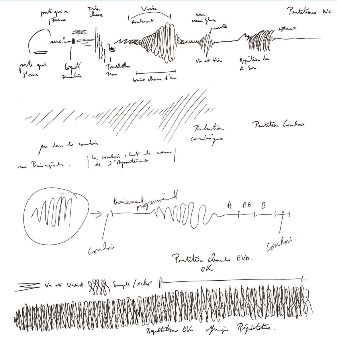 Les partitions sont celles de la musique que j’ai créé spécialement pour l’œuvre numérique; une partition pour chaque pièce de mon appartement.