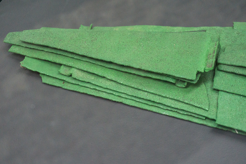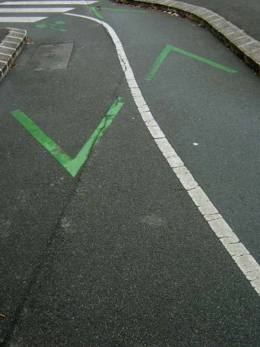 Arracher des morceaux de peinture signalétique. Les extraire de leur emplacement initial, par exemple place de parking, piste cyclable, lignes discontinues. Puis les empiler par ordre de taille.