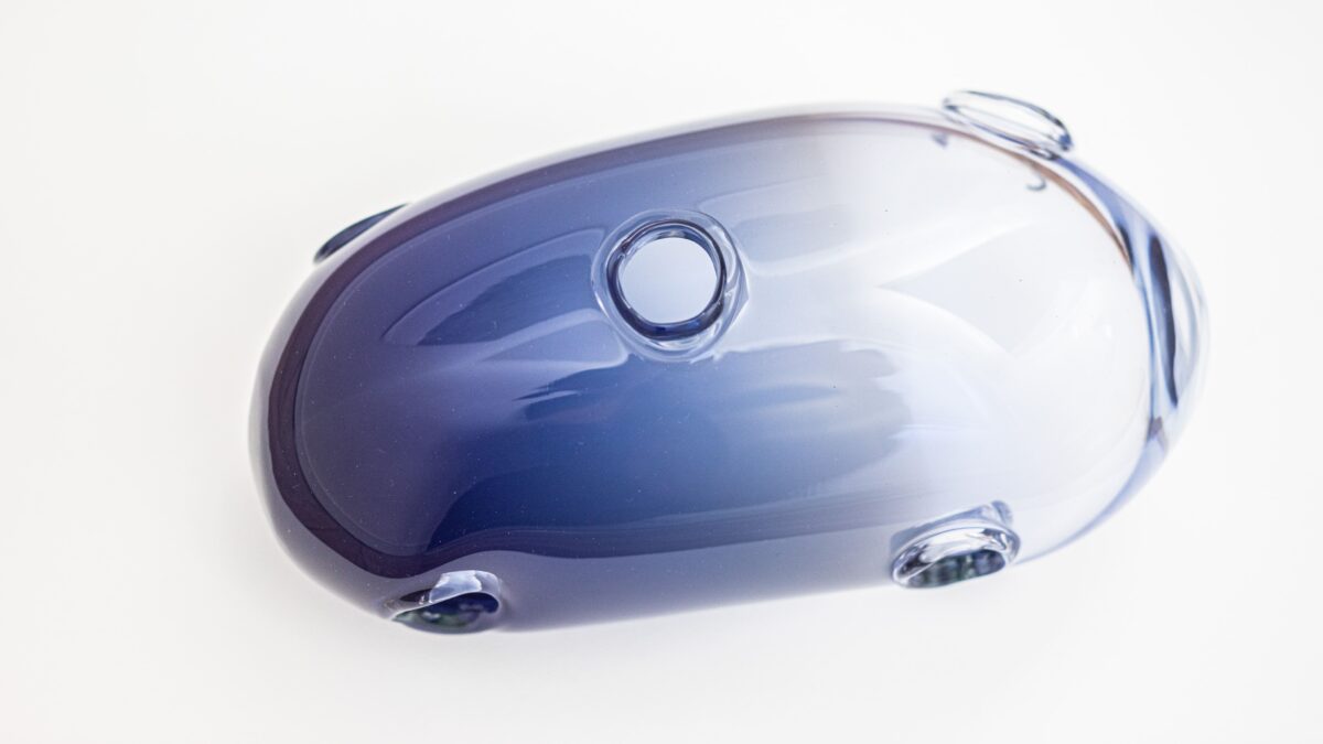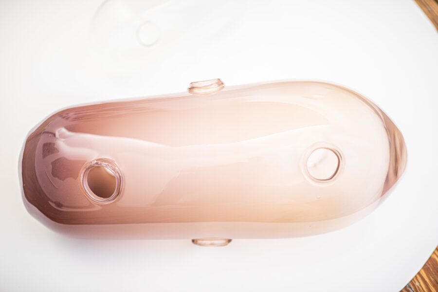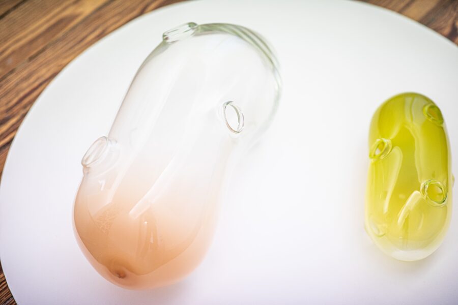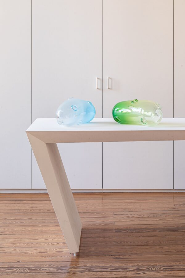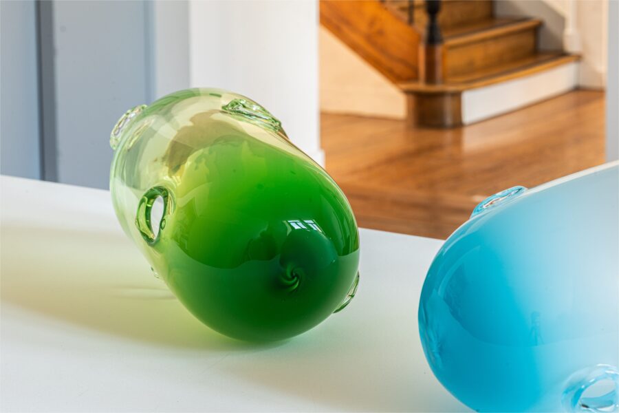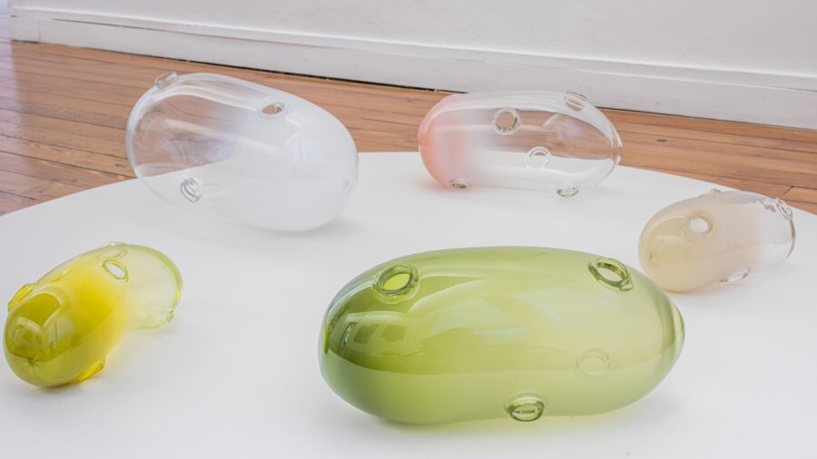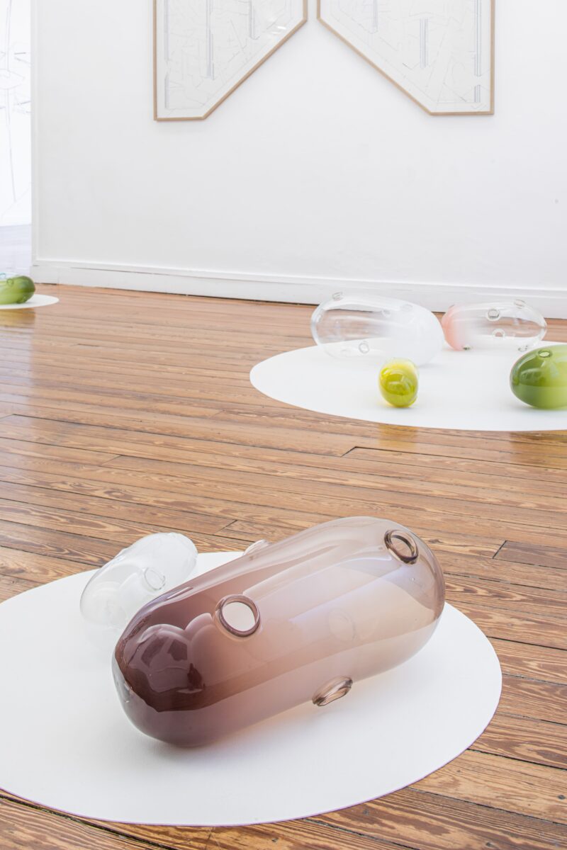 Sculptures en verre soufflé réparties en îlots, 21 éléments, linoléum, dimensions variables. En collaboration avec ARCAM GLASS, co-production Aide à la création de la Région des Pays de la Loire et Centre d’Art Contemporain de Pontmain vues de l’exposition "Poly-m", Centre d’Art Contemporain de Pontmain, 2021, avec au mur une œuvre de Keita Mori. © Adagp, Paris, 2024