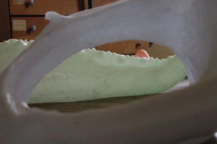 En m’installant dans la grande salle de paléontologie, je projetais de créer le fossile d’une chimère. Je choisis pour base le homard, sa carapace m’apparaissant alors riche de possibilités ! Je n’avais jusque là qu’une vague connaissance de cet arthropode, prise de contact culinaire… et à mon avis un peu surfaite.