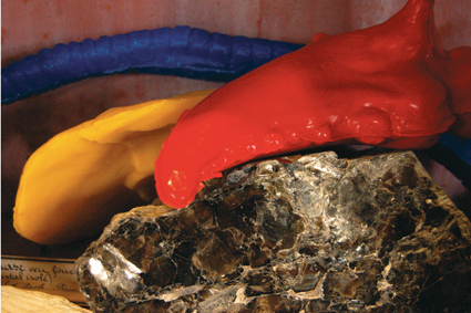 Alors, je l’avoue, j’ai joué sans autre intention que le plaisir des formes. Dans le silence studieux du musée, j’ai amoncelé des fragments translucides, insaisissables, trace d’un regard étonné sur des fossiles encore pleins de vigueur. J’ai aussi jeté de petits objets bariolés, moulages de pacotille, qui s’esclaffent au milieu des vieux os qui ronchonnent”.