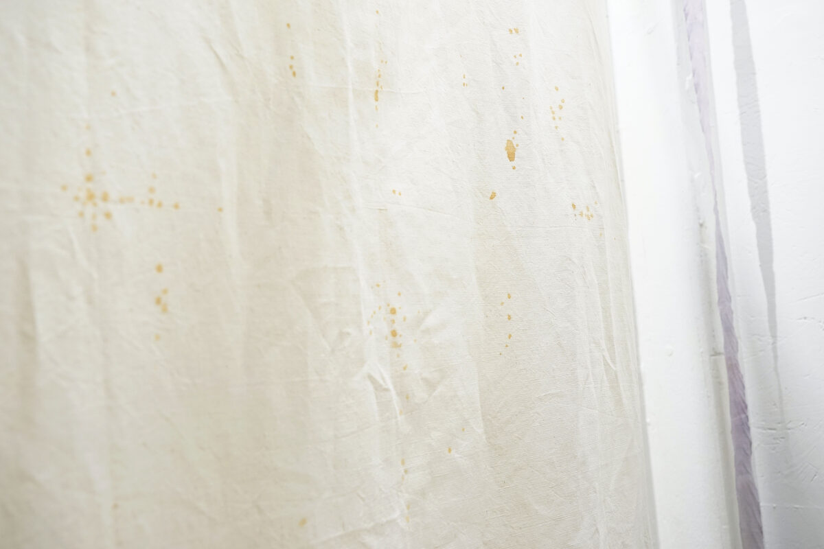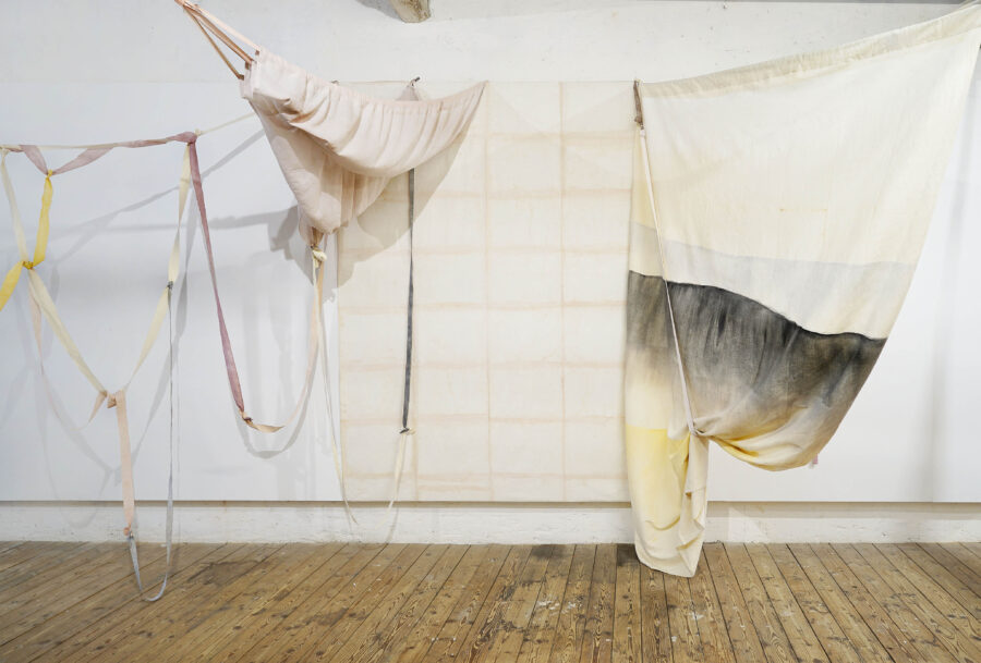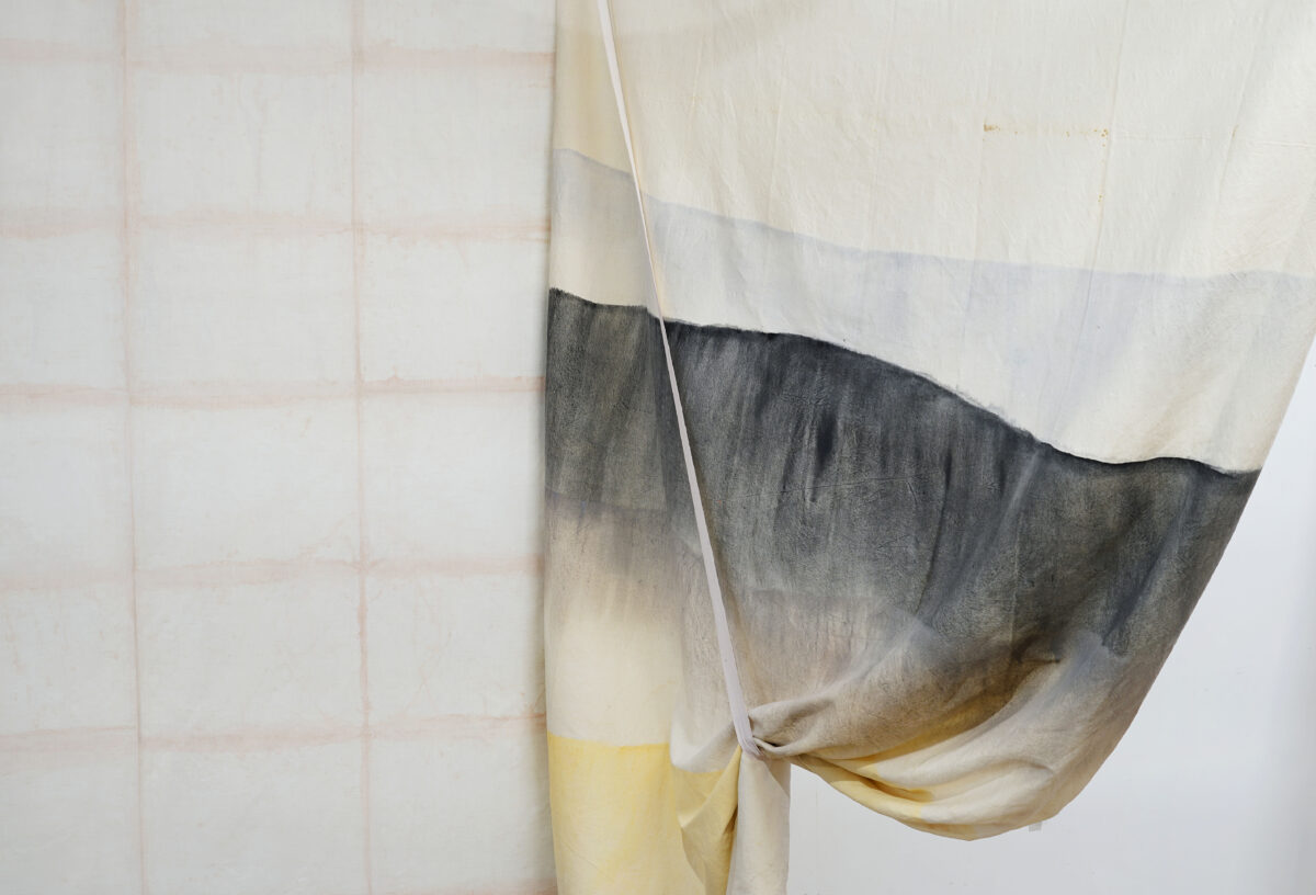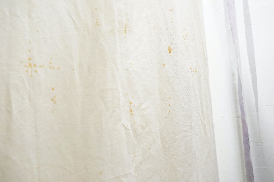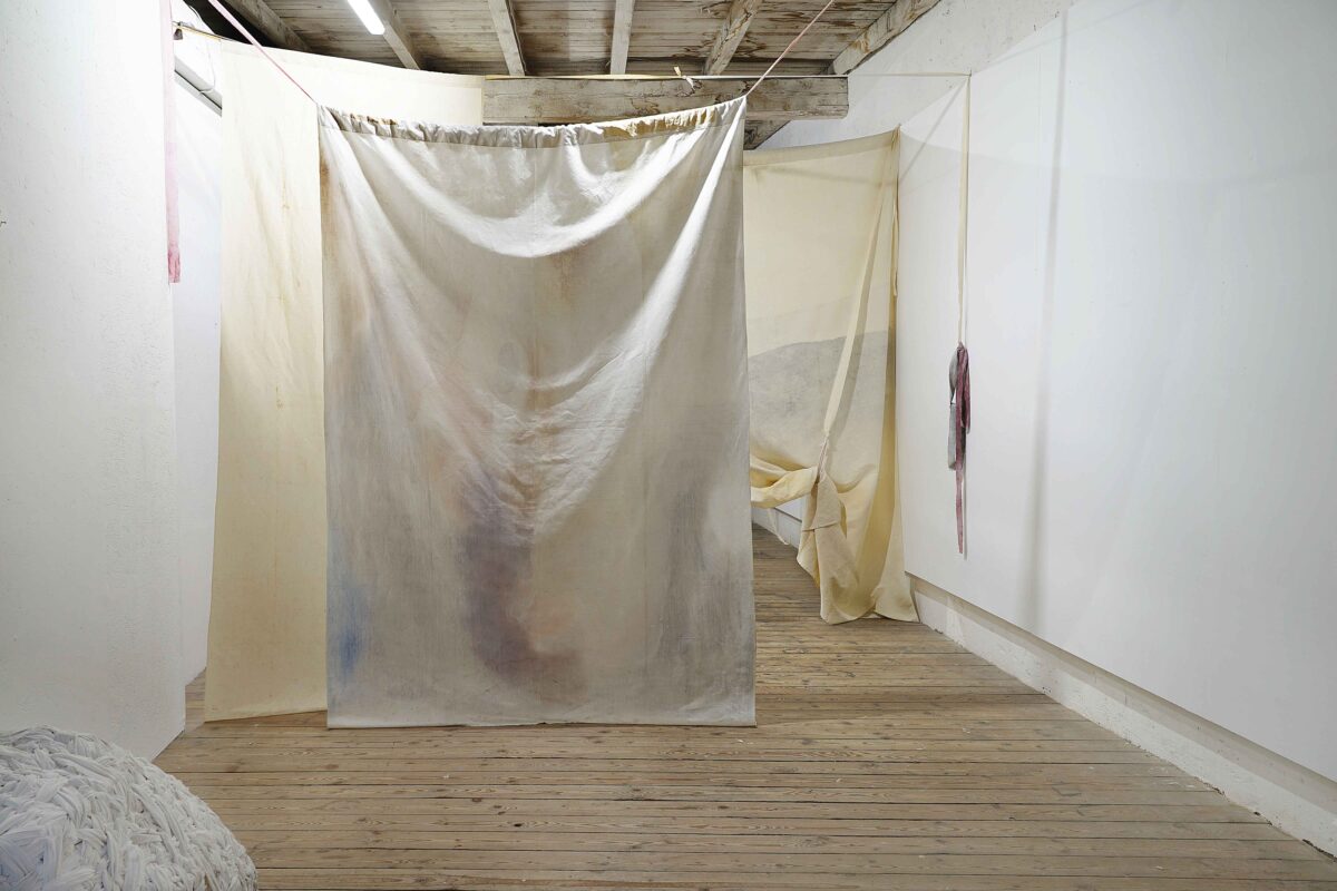 Le tissu est le support principal de mes peintures. Je collectionne les textiles du quotidien, ceux qui tapissent nos intérieurs, peuplent nos espaces domestiques et intimes. Tantôt usés, déchirés ou recyclés, la plupart des tissus sur lesquels je peins m’ont été donnés. Cette installation a été réalisée à partir de draps usés. Je les ai ré-utilisés, ré-activés par le geste picturale en jouant avec leurs aspérités afin de révéler leur potentiel pictural, narratif et poétique.