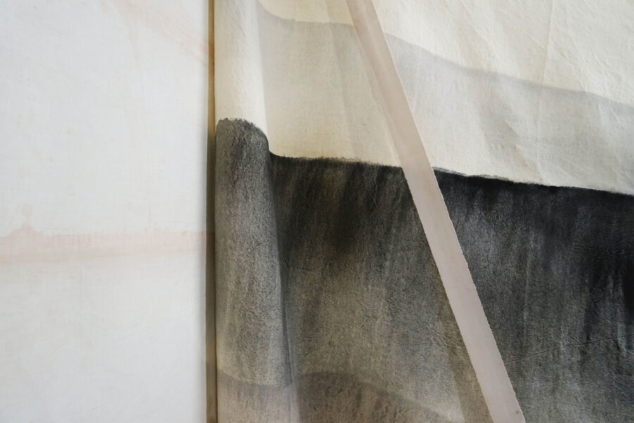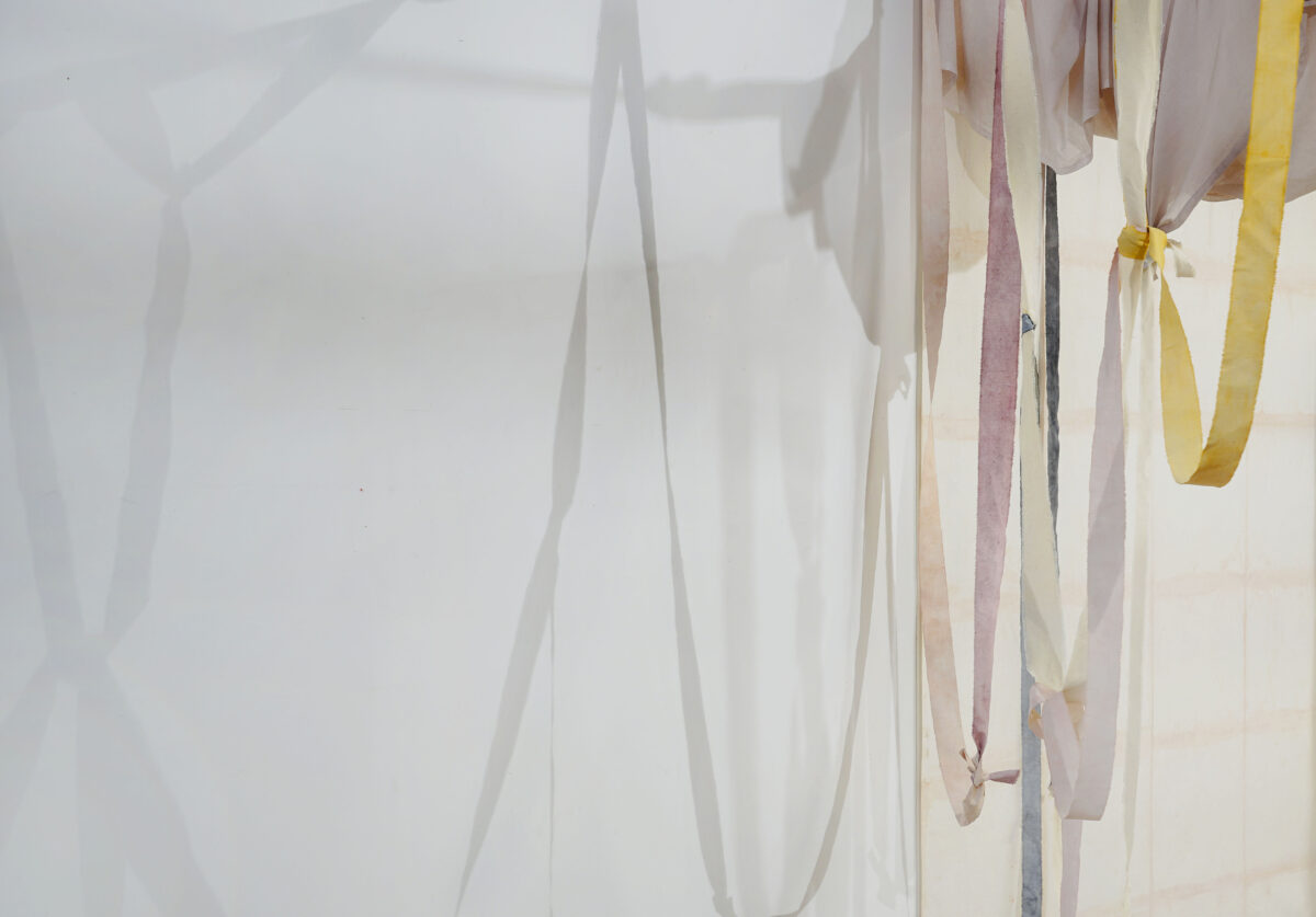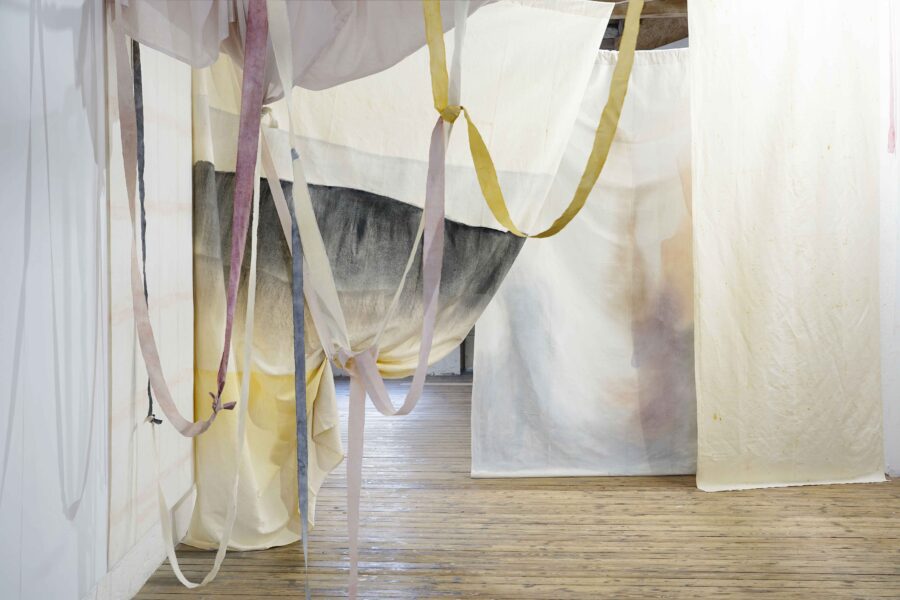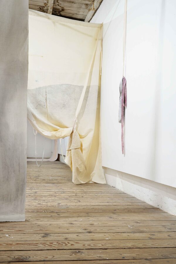 Du nouveau-né emmailloté au corps ensevelit du défunt, les linges nous protègent, nous isolent. Ils sont le lieu de l’amour charnel, le théâtre d’intimités plurielles, l’espace depuis lequel s’accomplissent des voyages immobiles vers des ailleurs fantasmés. Par un travail de scénographie, A la lueur des songes invite à cheminer à l’intérieur de la peinture, dans un espace doux et confortable. Cette installation s’apparente à une quête méditative, une invitation au voyage à travers la latence des matières, l’informe et le souvenir.