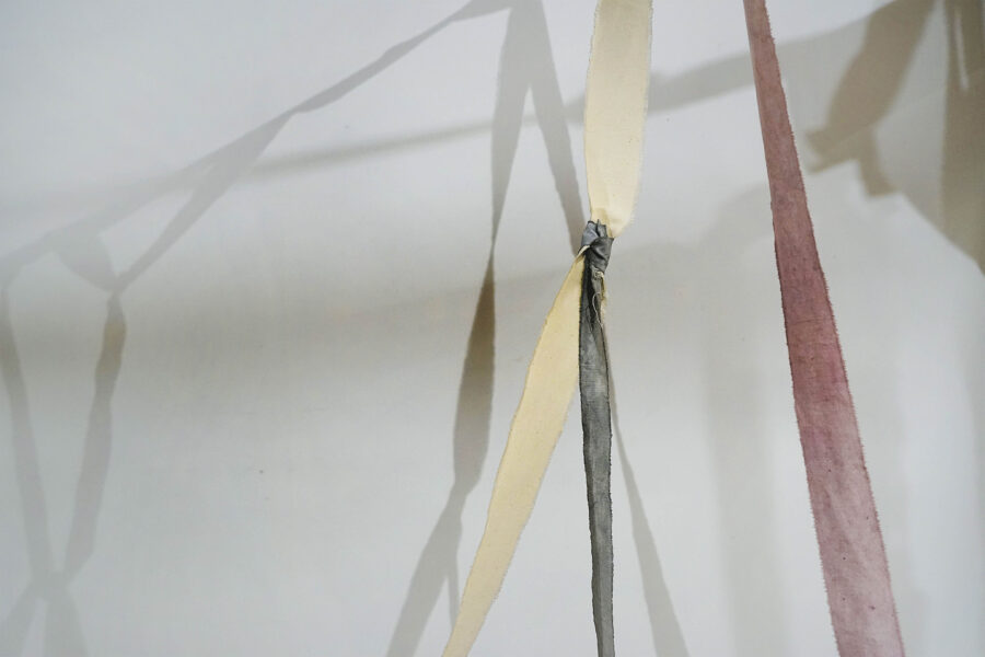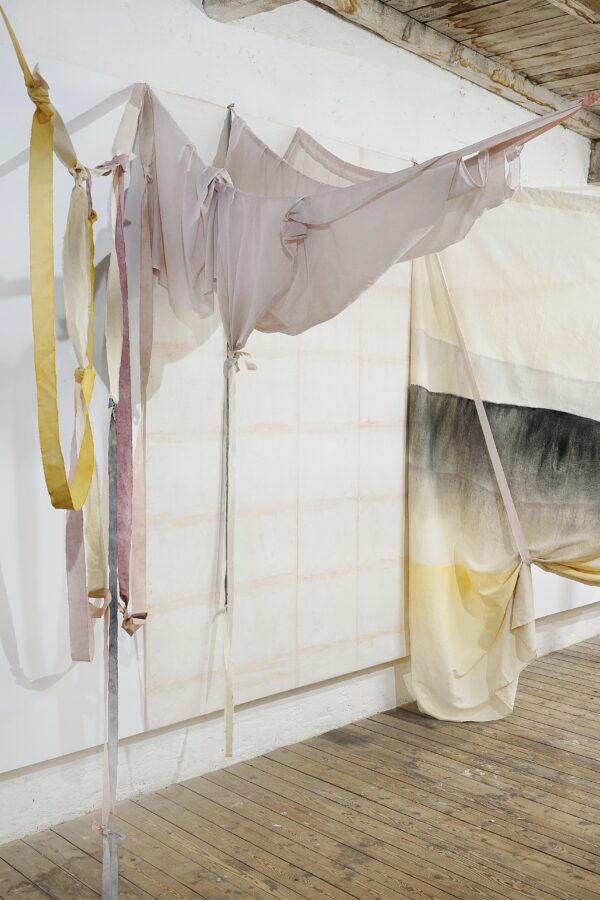 La limite infranchissable entre public et oeuvre est brisée, offrant une expérience des plus délicieuses au centre des couleurs. Plis, torsades, contours dialoguent avec des nuances innocentes – La fragilité devient une forteresse imprenable dont les murs tissés effacent la peur du dehors. Ce sont les mots d’Eluard qui ont guidé mes pas dans la frivolité des drapés…