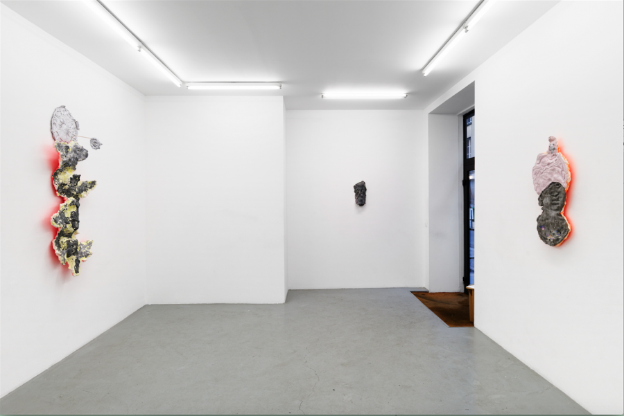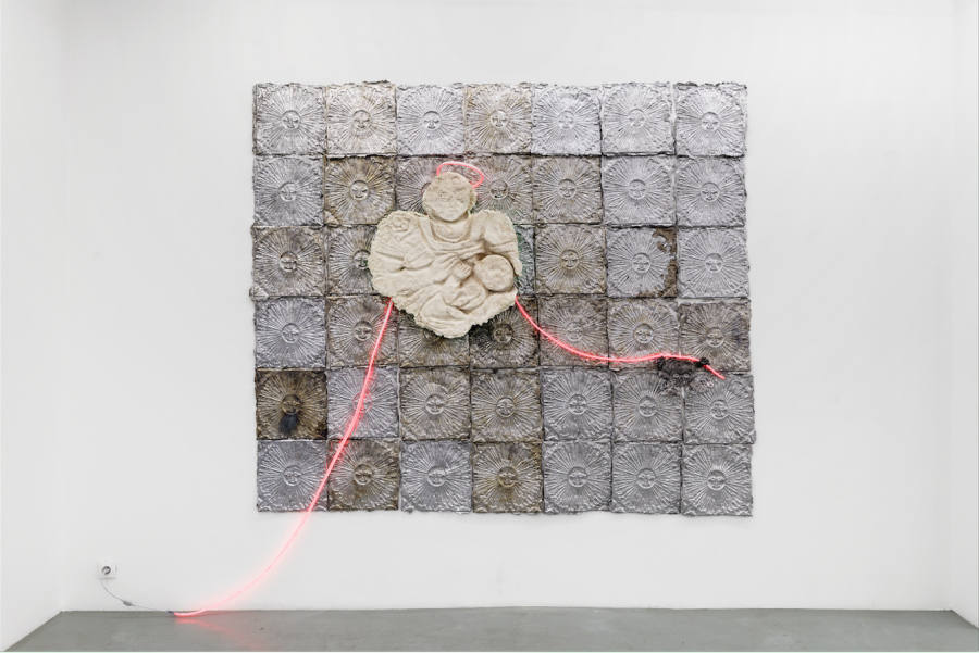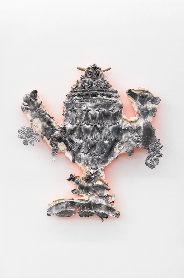 Jean-Baptiste Janisset pratique une sculpture de terrain. Par le moulage, il prélève in situ des éléments divers : des sculptures, des objets, des ossements. Sa démarche implique le déplacement et la rencontre. L’artiste arpente par exemple les rues de Nantes à la recherche des traces visibles et concrétes du colonialisme et de l’esclavage. À Nantes toujours, il découvre dans la cathédrale un emblème d’Anne de Bretagne au bas duquel est gravé « À ma vie ». L’artiste le moule sur place et réalise un tirage en plâtre de l’objet. Sur un rond-point à Ziguinchor au Sénégal, il moule une partie d’une sculpture rendant hommage à Aline Sitoé Diatta (1920-1944), une résistante casamançaise surnomme?e la « Jeanne d’Arc d’Afrique ». La jeune femme aurait en effet reçu une prophétie, elle entendait des voix lui demandant d’aider à l’indépendance de la Casamance. Guidée par les voix, elle active un mouvement de désobéissance et d’émeutes. Aline Sitoé Diatta est arrêtée, condamnée par l’administration française et déportée au Mali. Elle meurt du scorbut à l’âge de 24 ans et bénéficie aujourd’hui d’une aura de martyre.