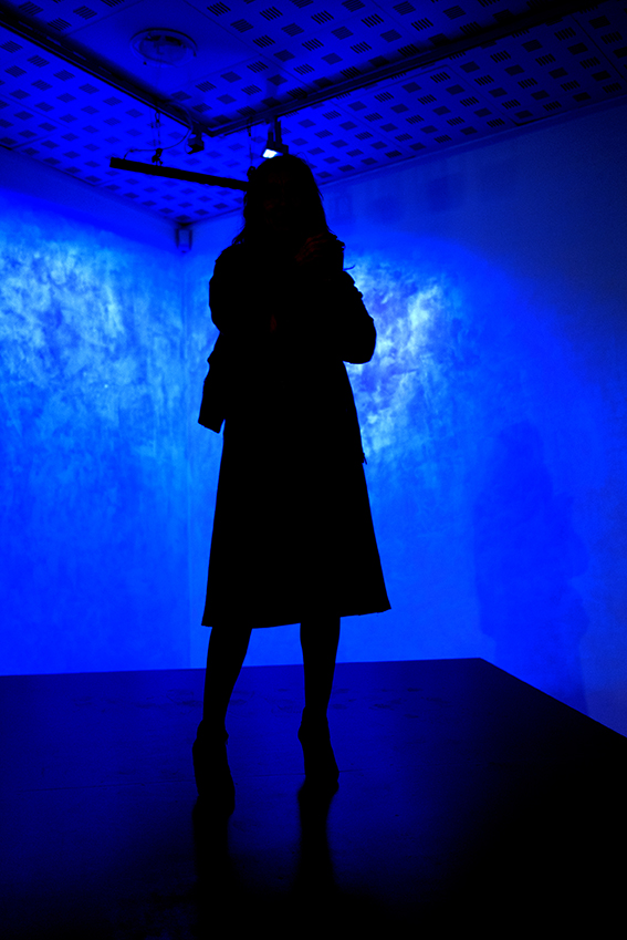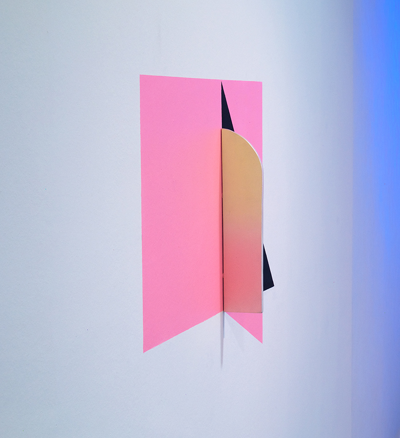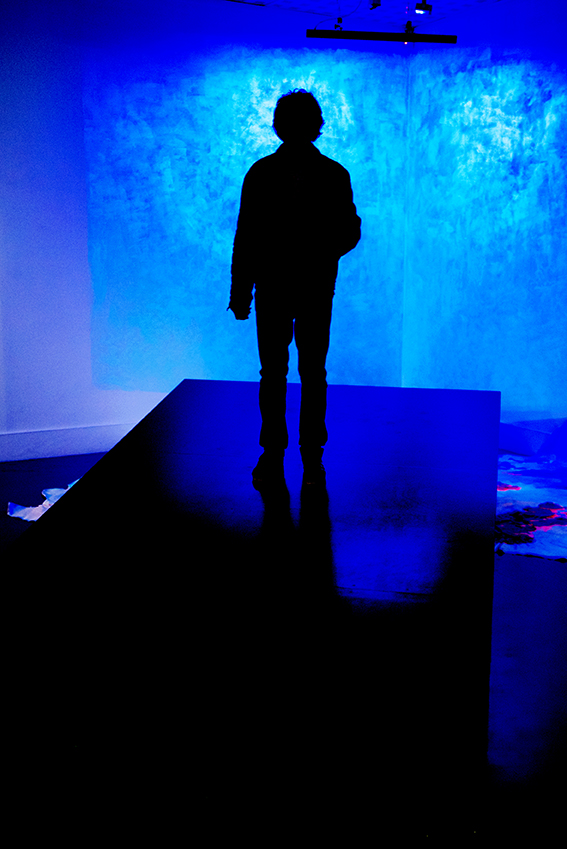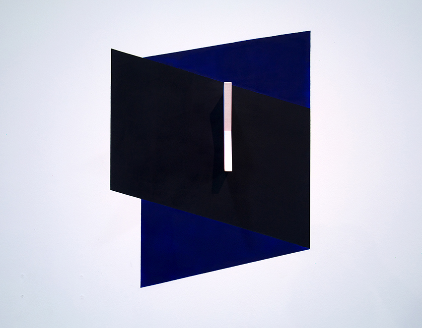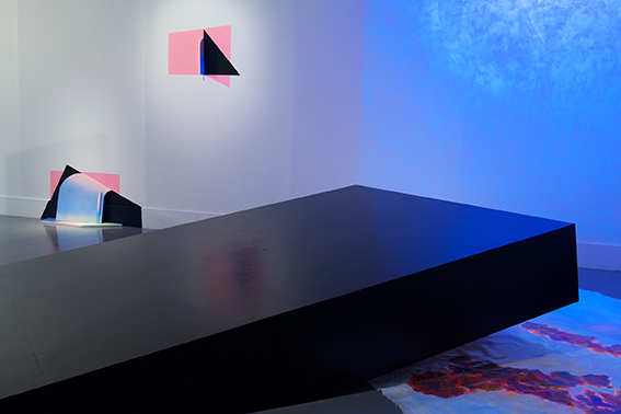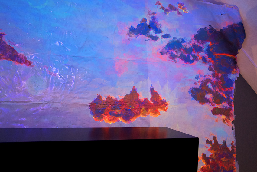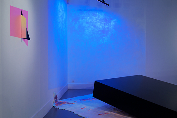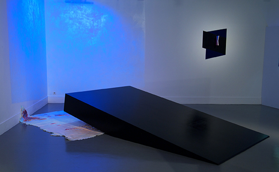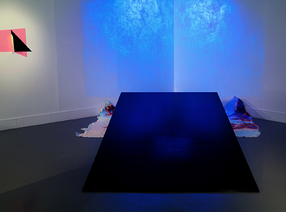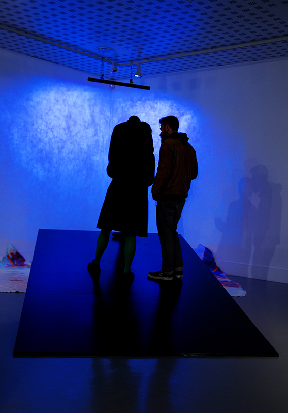 MONOLITHE fait face à un wall painting photoluminescent rappelant une constellation et/ou un écran vidéo utilisé dans les salles de simulation de vol, il surplombe ( survole) une peinture de ciel soleil couchant, déjouant les dimensions spatiales. Il reprend les codes de » 2001 l’odyssée de l’espace » tout en s’inspirant des rampes de lancement. – Photographies Jean-Marie Lambert ©ADAGP Laurence Broydé