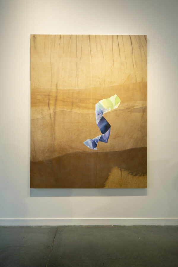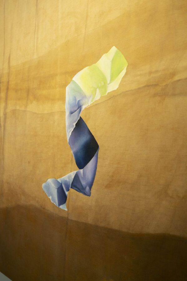 Cette toile illustre la rencontre entre des couleurs issues de la terre et des couleurs fabriquées par l’humain. Elle est l’image d’une scène dont le protagoniste est un morceau de tissu synthétique qui flotte dans un espace aqueux et aride à la fois. Le tissu supporte la couleur. La couleur exulte le mouvement du textile.