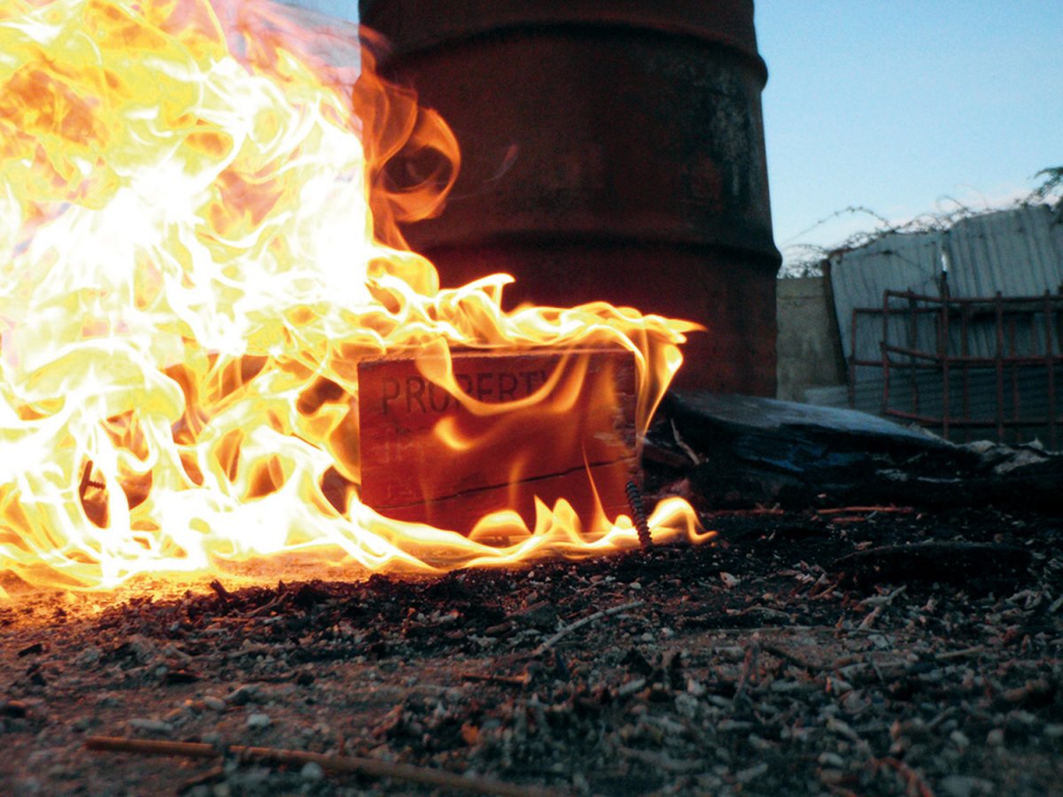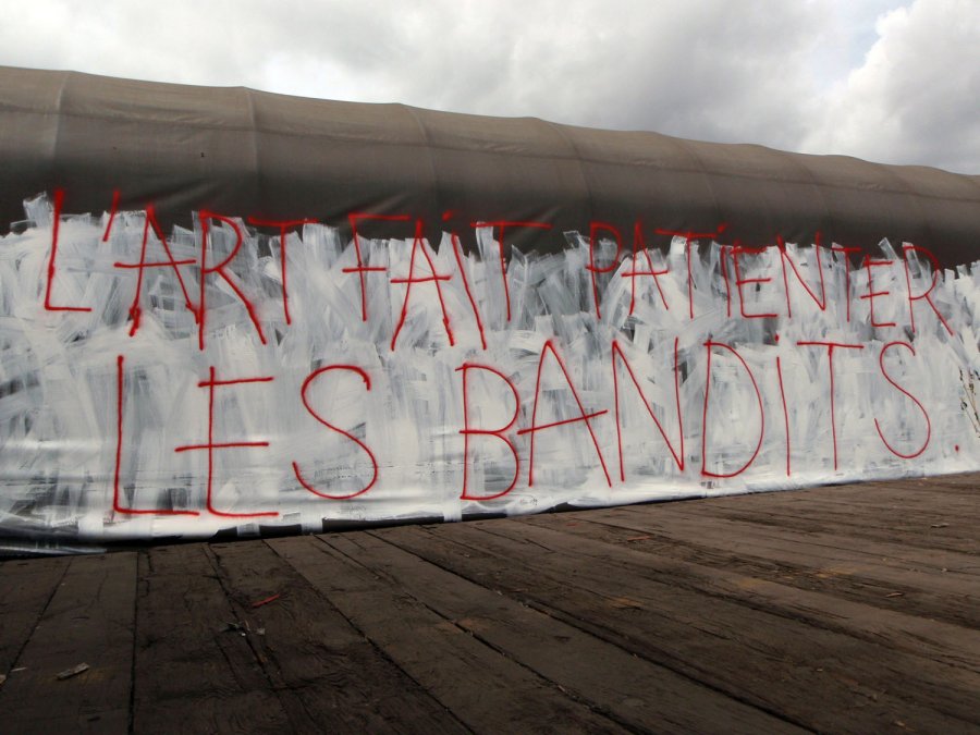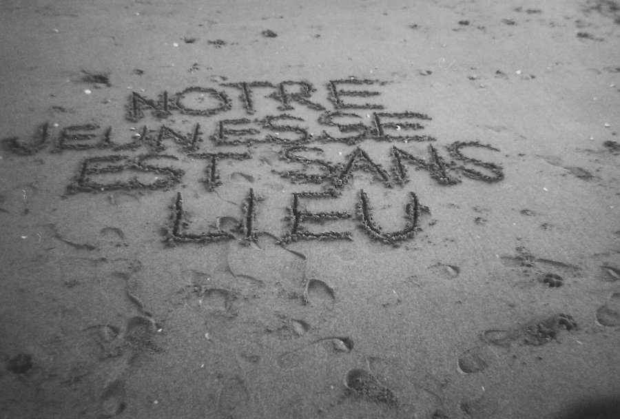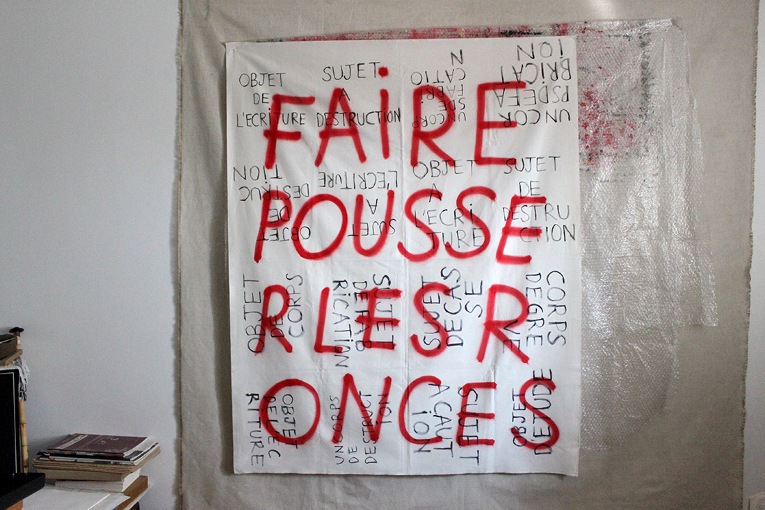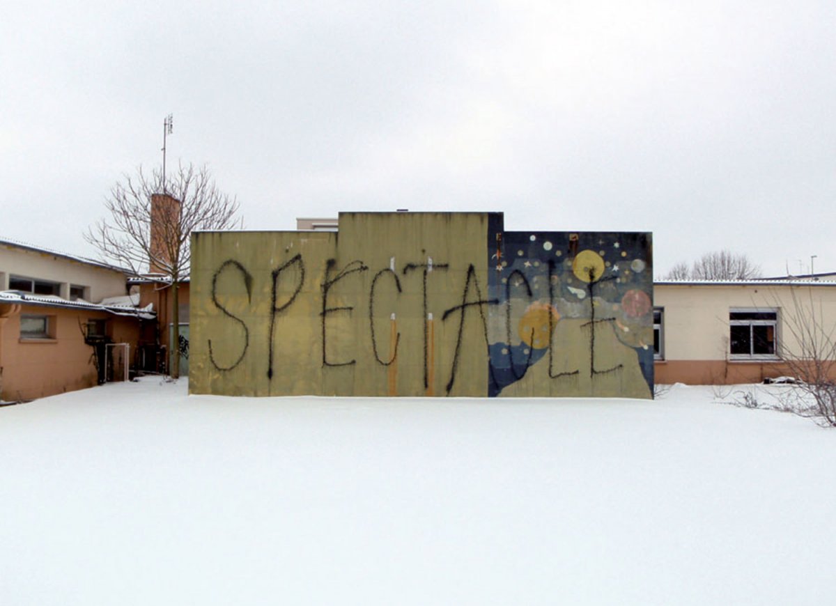 Qui écrit sur les murs des ruines, les wagons de train abandonnés, les déchets, les rochers, les sols maculés de taches, les maisons désertes ? Cette “écriture hors page, contextuelle”, est semblable à la voix de l’oracle : elle ne raconte ni ne décrit, elle dévoile. Elle montre quelque chose qui advient et qui pourtant est déjà là. Que nous ne voyons pas. Elle nomme une réalité, désigne une situation accomplie. Que nous ne savons nommer en dépit de sa trop grande proximité. “Les portes fermées du monde”, “spectacle”, “l’école est finie”, “démissionner”, “manier, “désister”, “l’art fait patienter les bandits” …