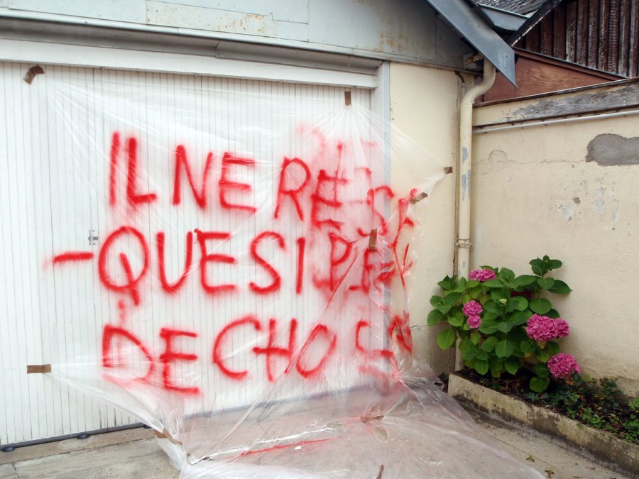 Acte-texte est une suite de tentatives, une réponse aux nombreux questionnements relatifs à la matérialité de l’écriture et à la situation du Poème au monde. Substituer à l’illusion du Poème comme nécessité absolue la réalité littéral d’une expérience. Il s’agit là de concentrer l’objet de l’écriture et l’écriture de l’objet, le lieu de l’écriture et l’écriture du lieu. Ce mot-valise réfutant la séparation du texte et du geste, m’est venu après avoir commencé une suite d’interventions contextuelles liant écriture, action et prise de vue. J’ai débuté ce travail en 2010, de manière intensive entre en 2010 et 2016. L’idée était de déborder le carnet en plaçant l’écriture en dehors du livre, de rendre l’écriture public par un geste de publication hors-pages. Mais cette écriture devait toujours être située, n’être ni politique ni poétique, toujours entre et à lieu. Alors, dans un contexte précis, une phrase était faite, au regard d’une réalité littérale et des histoires-lieux de mes errances. La photographie est considérée ici comme document, seul reste témoignant du geste. Il s’agissait aussi et parallèlement, durant toute cette période, de proposer une sorte de nouvelle forme de pratique de l’écriture, de dépasser les pratiques militantes habituelles en investissant le sens et la forme de chaque projectile.